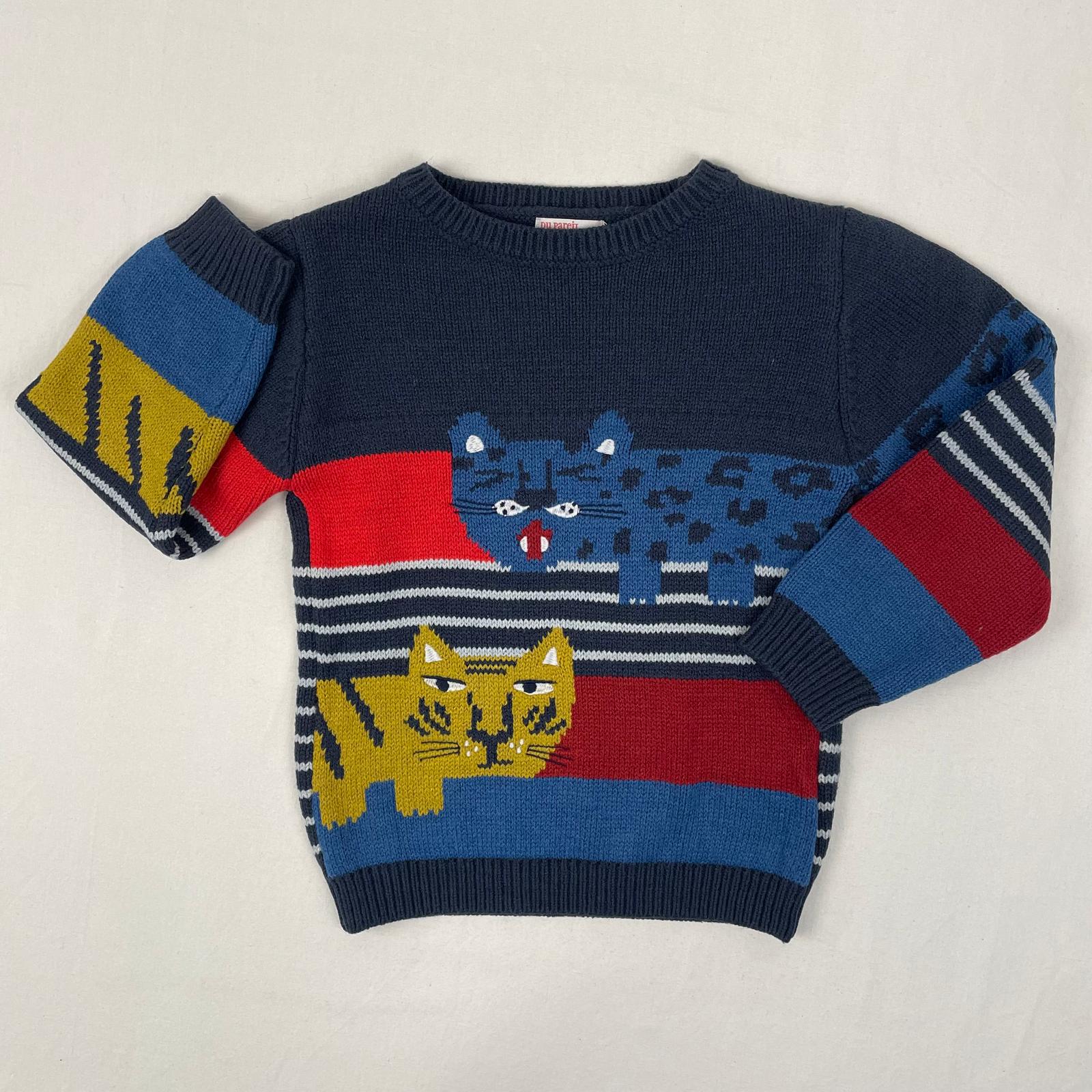 Autres commentaires : Pull bleu avec des motifs, col rond, ouvertures élastiques.