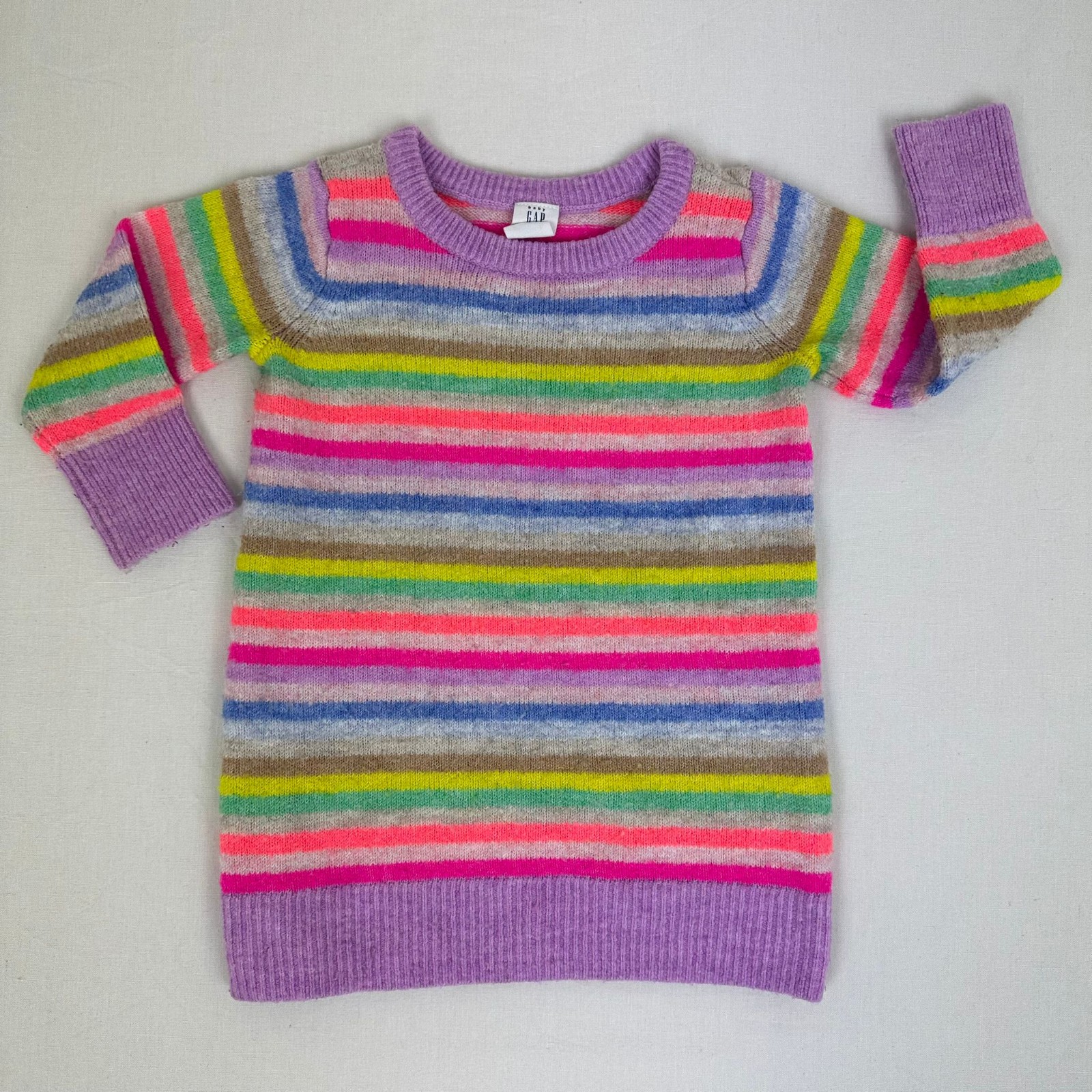 Autres commentaires : 22% polyester et 3% elasthanne. Pull en maille multicolore violet, orange, rose et beige.