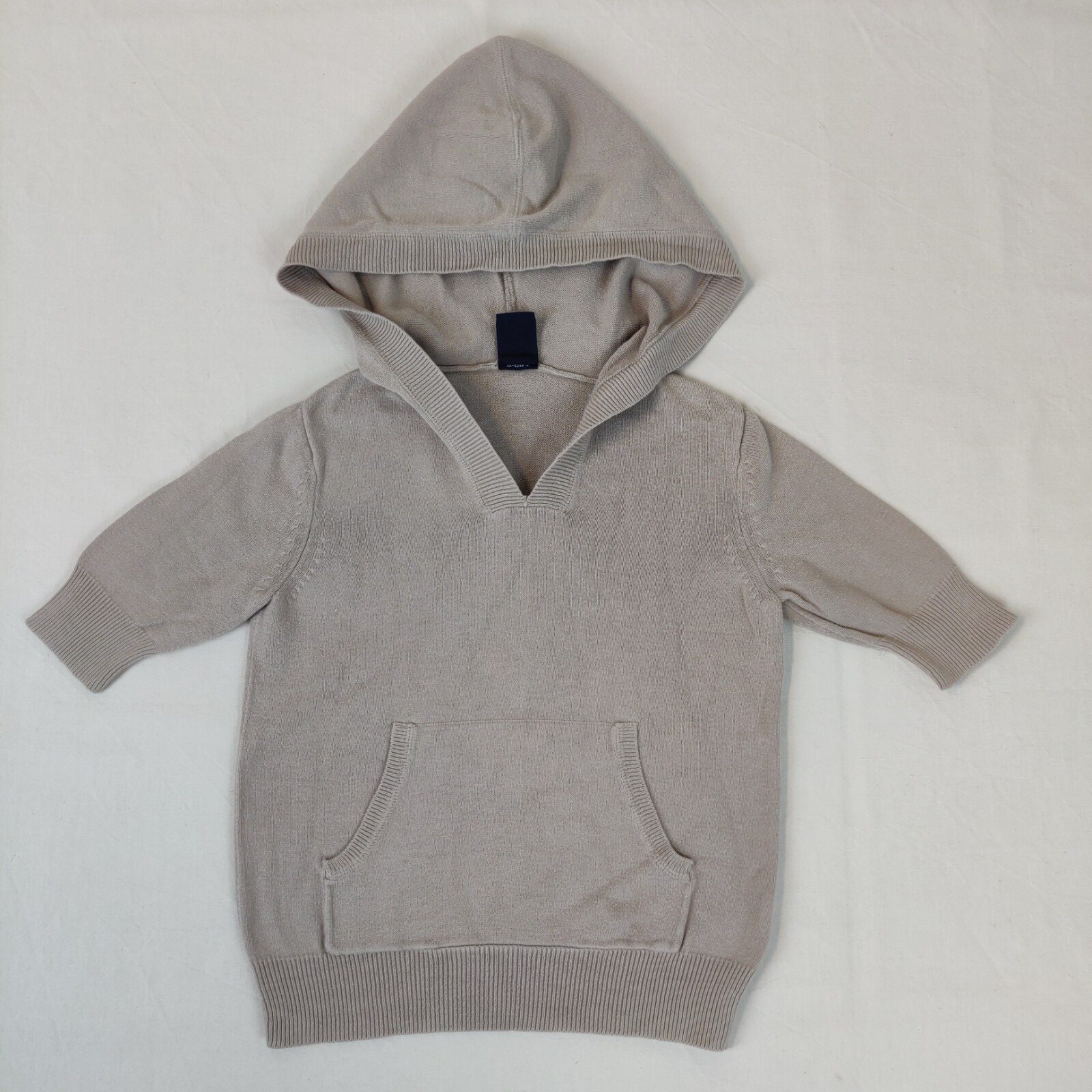 Autres commentaires : Pull à manches 3/4 et à capuche en fines mailles beiges. Une double poche centrale. Usure normale.