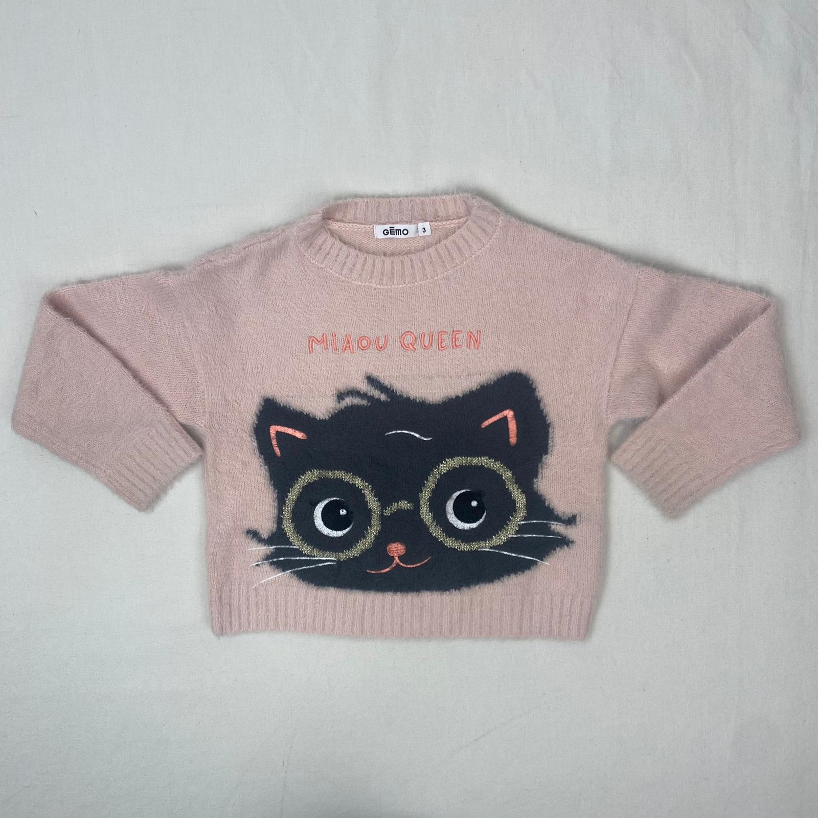 Autres commentaires : 45% acrylique. Pull rose clair en maille à poils, devant motif tête de chat grise à lunettes scintillantes avec inscription brodée rose ‘Miaou Queen ».