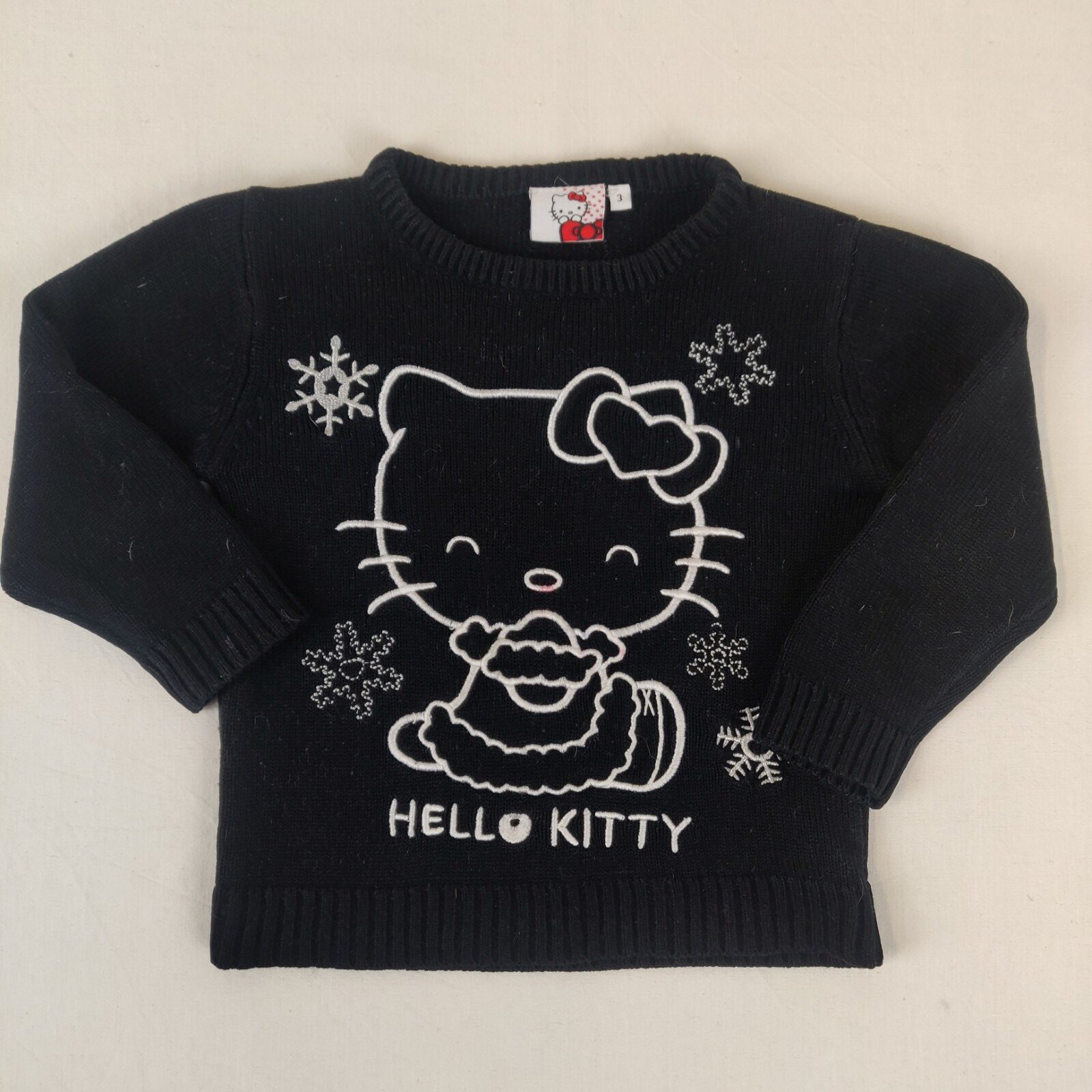 Autres commentaires : Pull en fines mailles noires. Motif central blanc cousu Hello Kitty. Petite tâche rouge au centre. Niveau réduit de fraise à myrtille.