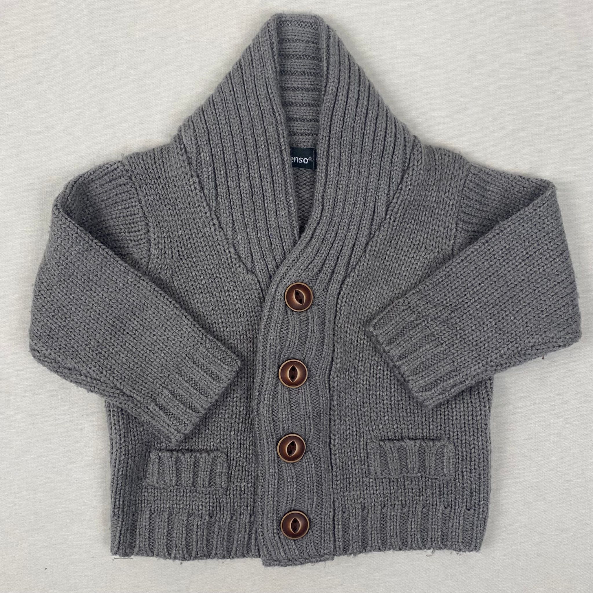 Autres commentaires : Pull gris en maille, col châle, fermeture avec boutons en bois.