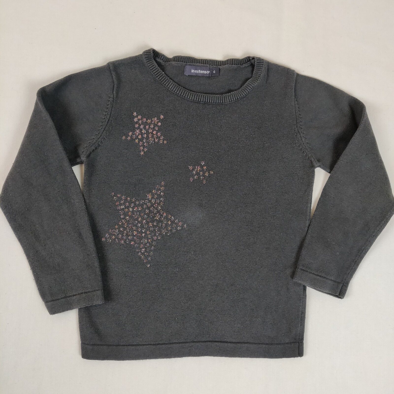 Autres commentaires : Pull en fines mailles – gris foncé avec motifs centraux étoiles roses pailletées. Très léger effet pelucheux.