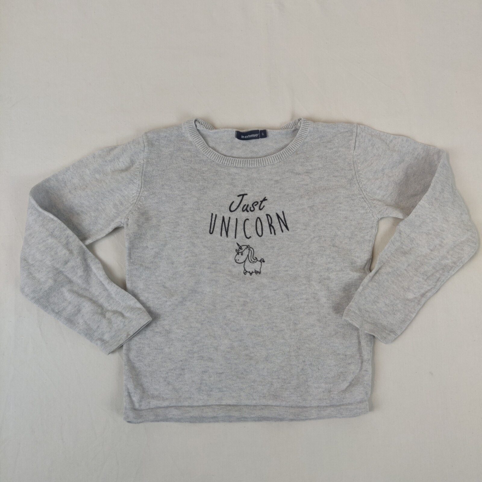 Autres commentaires : Pull en fines mailles – gris chiné. Motif central licorone noire pailletée accompagné de l’inscription « Just unicorn ».