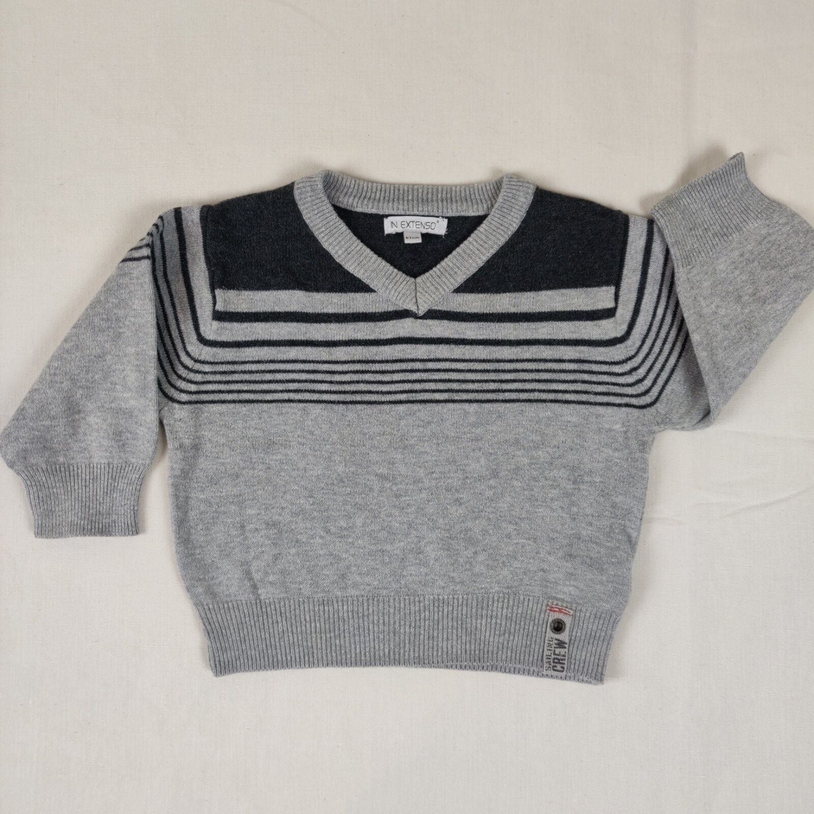 Autres commentaires : Pull gris à col V, rayures gris foncé en haut du buste.