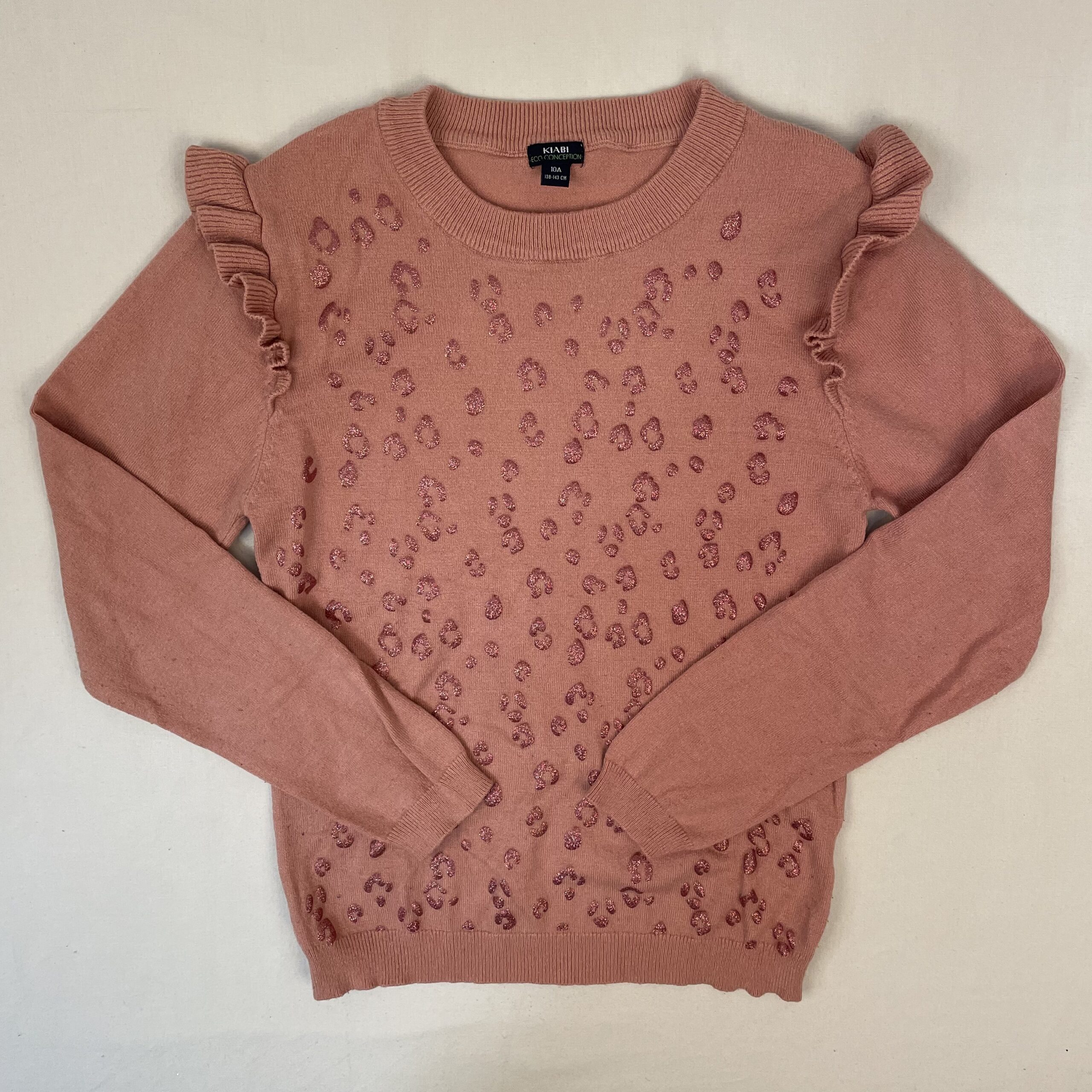 - Pull fin rose pêche, volanté aux épaules, devant parsemé d’éléments pailletés rose foncé.