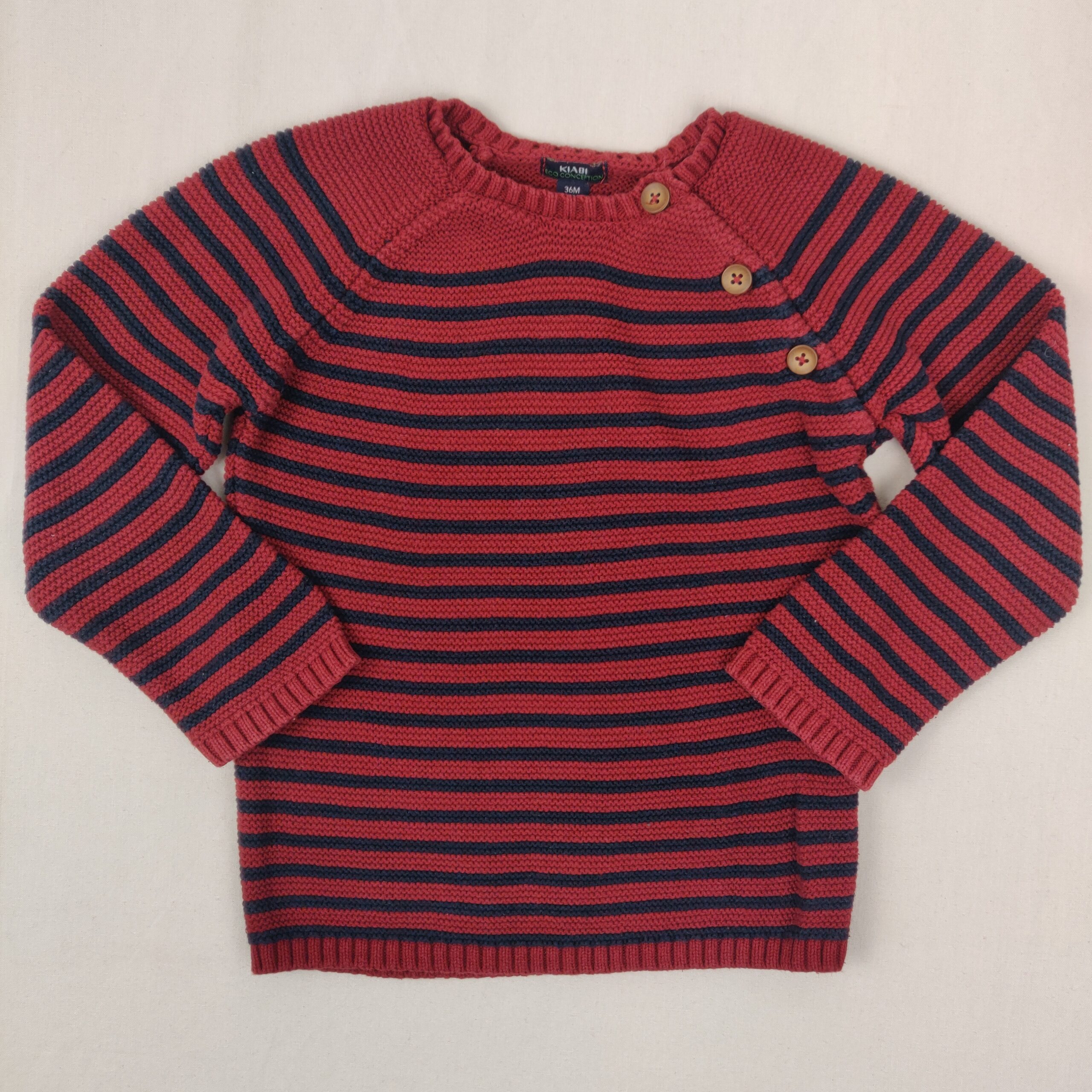 Autres commentaires : Pull rayé rouge et bleu marine avec des boutons au niveau de l’épaule.