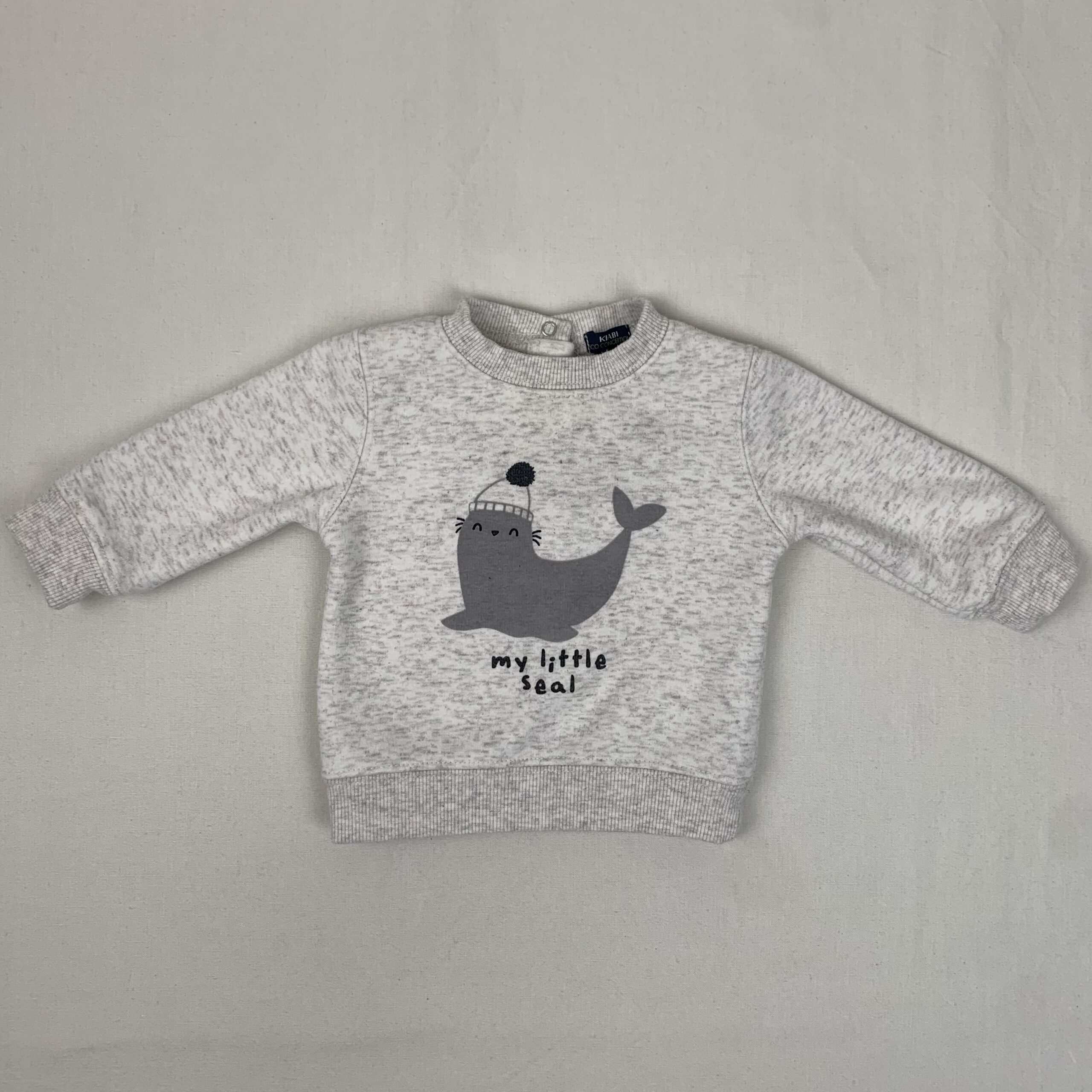 Autres commentaires : Pull Kiabi eco conception gris avec image à l’avant et inscription « my little seal », fermeture boutons pressions au dos , col rond