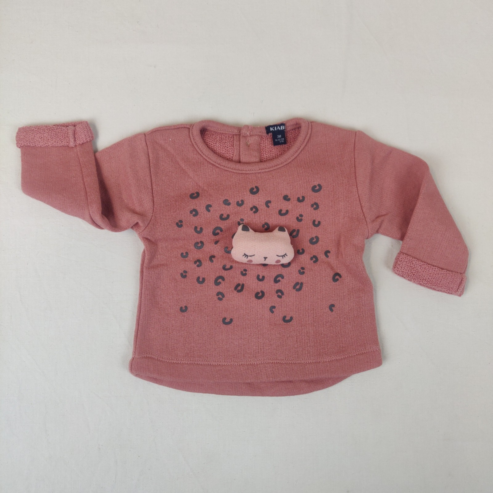 Autres commentaires : Pull rose avec un petit chat à l’avant et fermeture à boutons à l’arrière 64% coton, 27% polyester et 9% viscose.