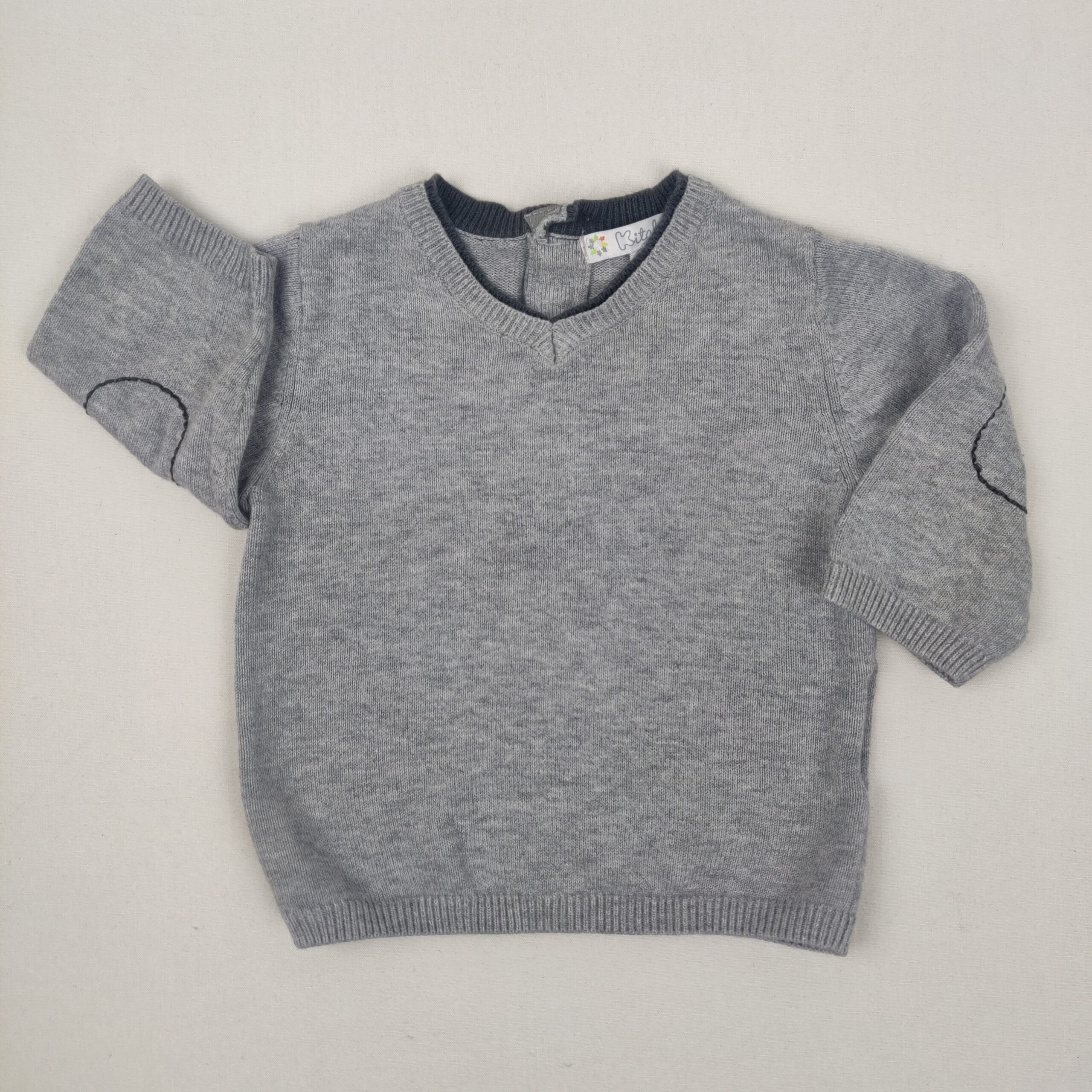 Autres commentaires : Pull col v, motif sur manches type coudière, fermeture par boutons pression au dos.