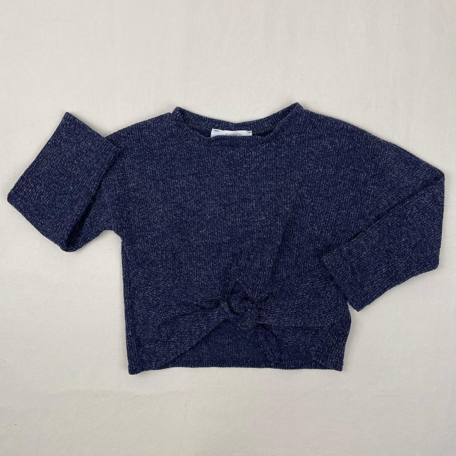 Autres commentaires : Pull bleu marine avec fils gris, noeud en bas devant, 10% viscose, 4% élasthanne.