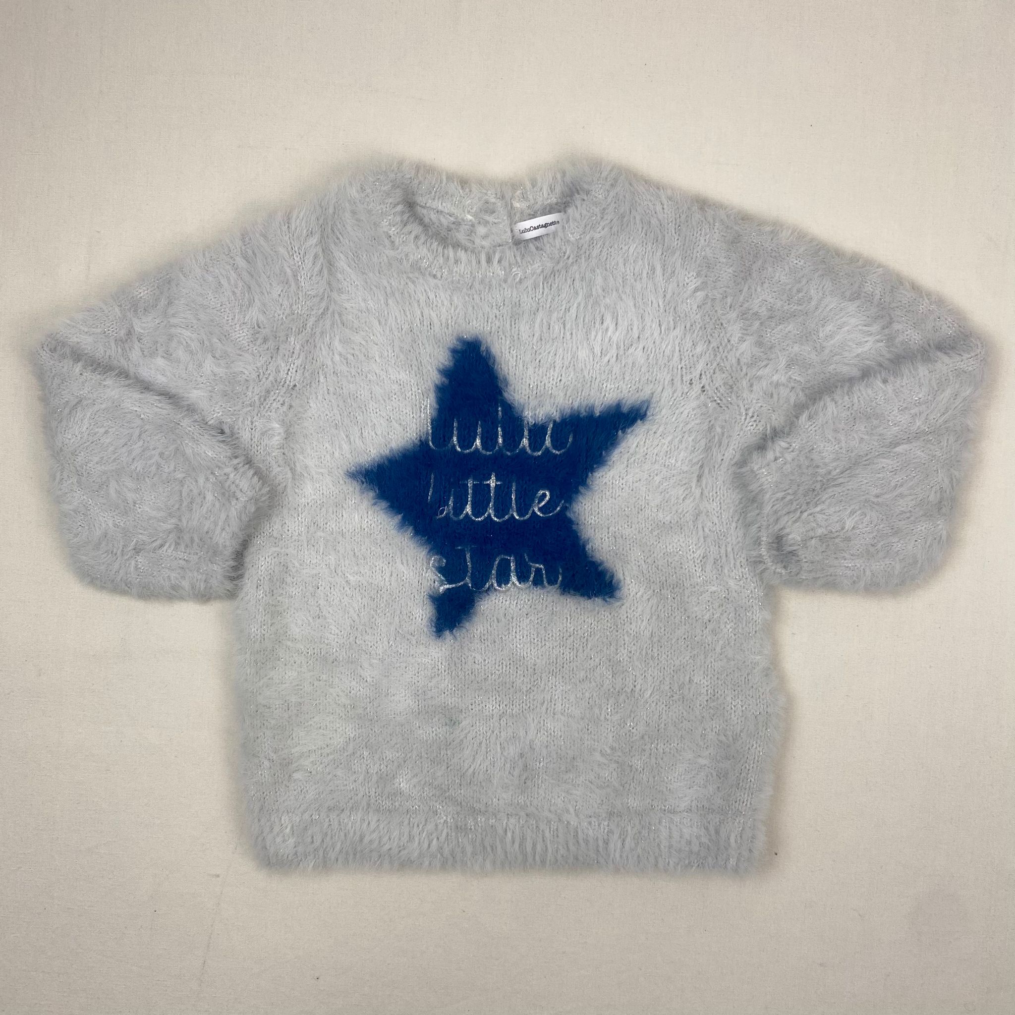 Autres commentaires : 4% fibre métallique, 2% polyester, Pull blanc avec un motif d’étoile bleue à manches longues, col rond, femeture par boutons au dos