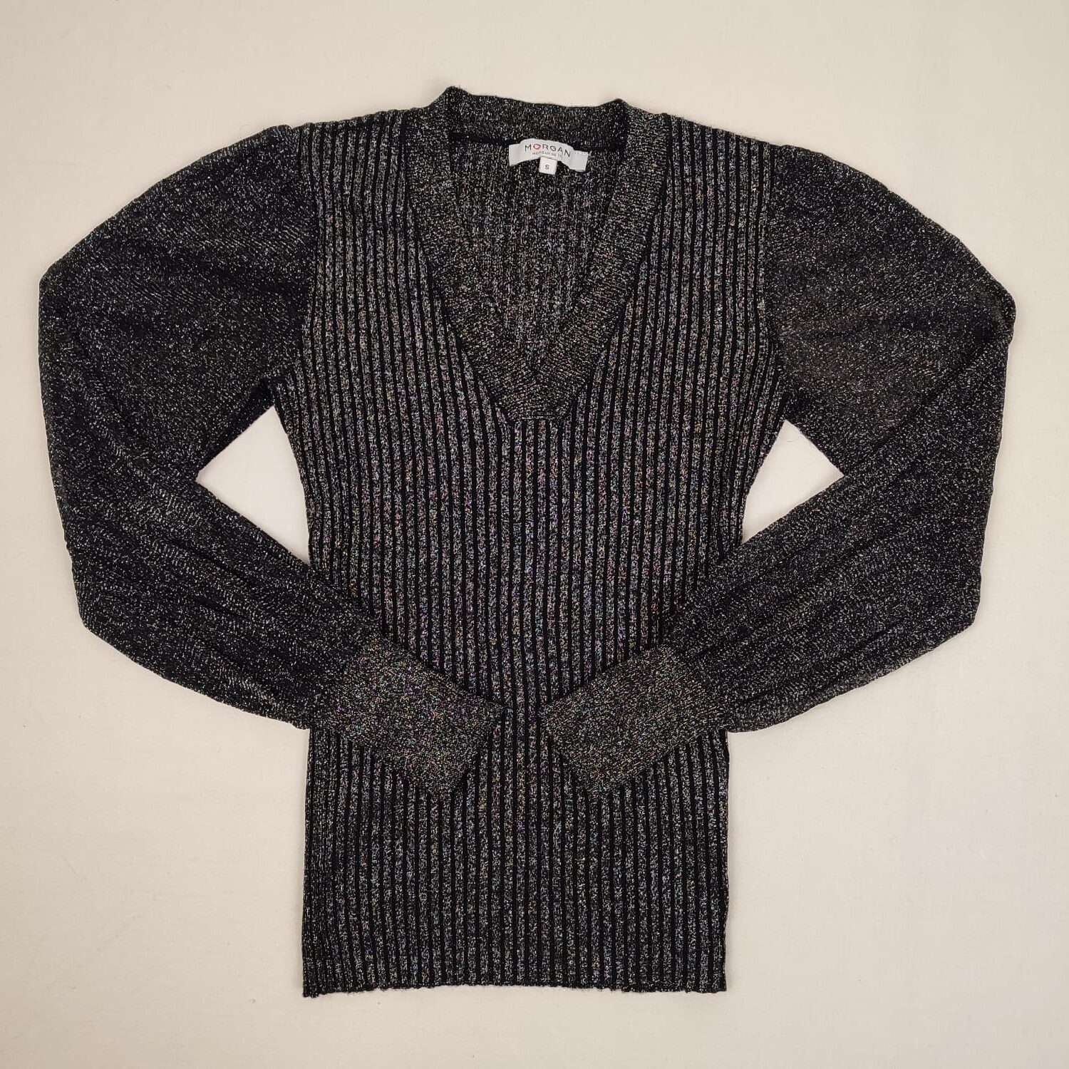 Autres commentaires : 14% polyester, 13% polyamide et 7% fil métallisé – Pull fin à manches longues, noir et argenté en maille côtelée, col V, manches en 90% polyamide et 10% fil métallisé.