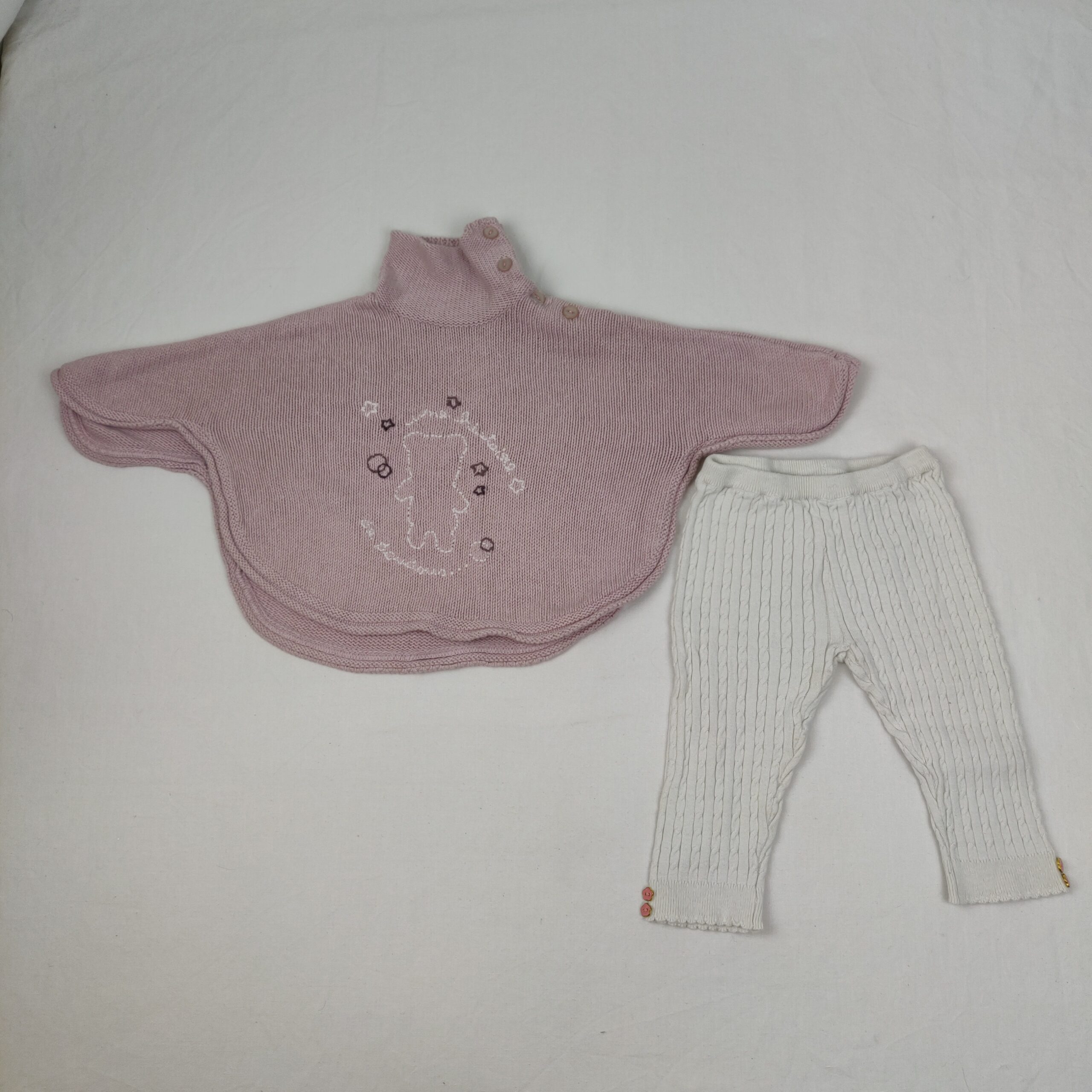 Autres commentaires : Ensemble 2 pièces dont – 1 leggings blanc cassé Sergent Major, en maille torsadée avec boutons dorés sur le côté de chaque jambe, taille élastique, 79% coton, 21% polyamide légere trace orangée à l’arrière au niveau de l’entrejambe) – 1 cape rose pâle Kitchoun, en lainage avec col cheminée (haut), ouverture avec boutons sur le côté gauche du col, motif brodé silhouette d’ourson, 60% coton et 40% acrylique.