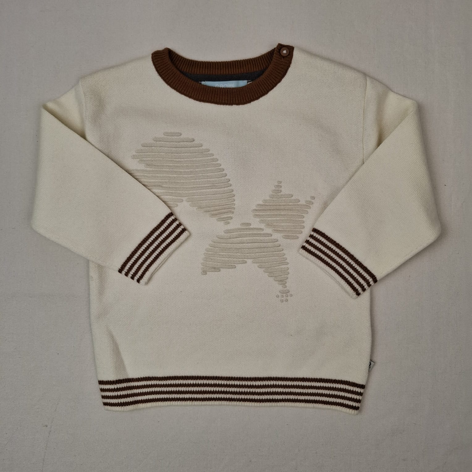 Autres commentaires : 20% polyamide. Pull écru, col rond, fermeture par bouton sur l’épaule gauche, finition bord-côte autour de le col à la base et en bas de manche.