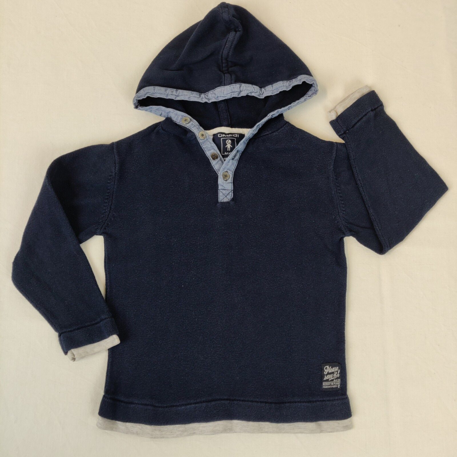 Autres commentaires : Pull à capuche en fines mailles bleu marine. Ouverture centrale à 4 boutons. Effet bandes superposées gris chiné au niveau des manches et de la taille. Usure normale.