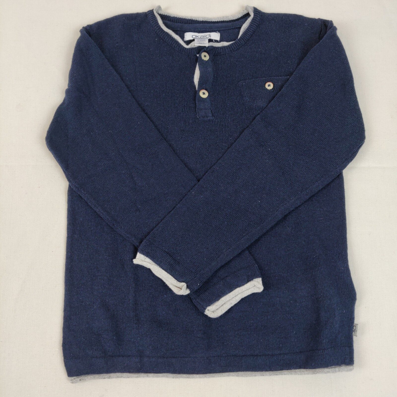 Autres commentaires : 20% lin. Pull léger en mailles fines bleu marine. Ouverture centrale à partir du col à 2 boutons classiques nacrés. Pochette centrale ornée d’un bouton nacré décoratif. Liseré gris clair chiné au col, à la taille et aux manches.