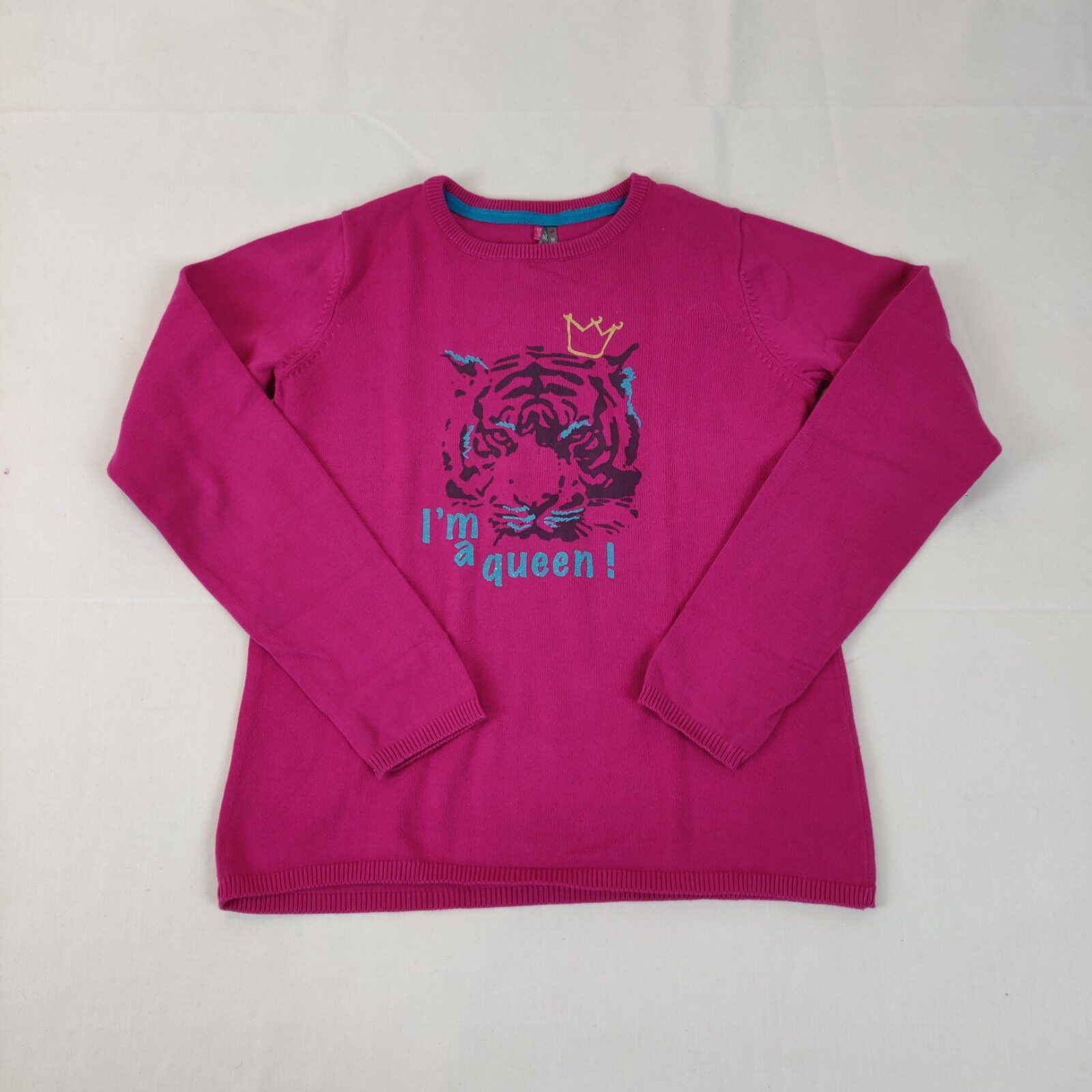 Autres commentaires : Pull – rose fushia avec motif tigre et inscription bleue pailletée « I’m a queen! ».