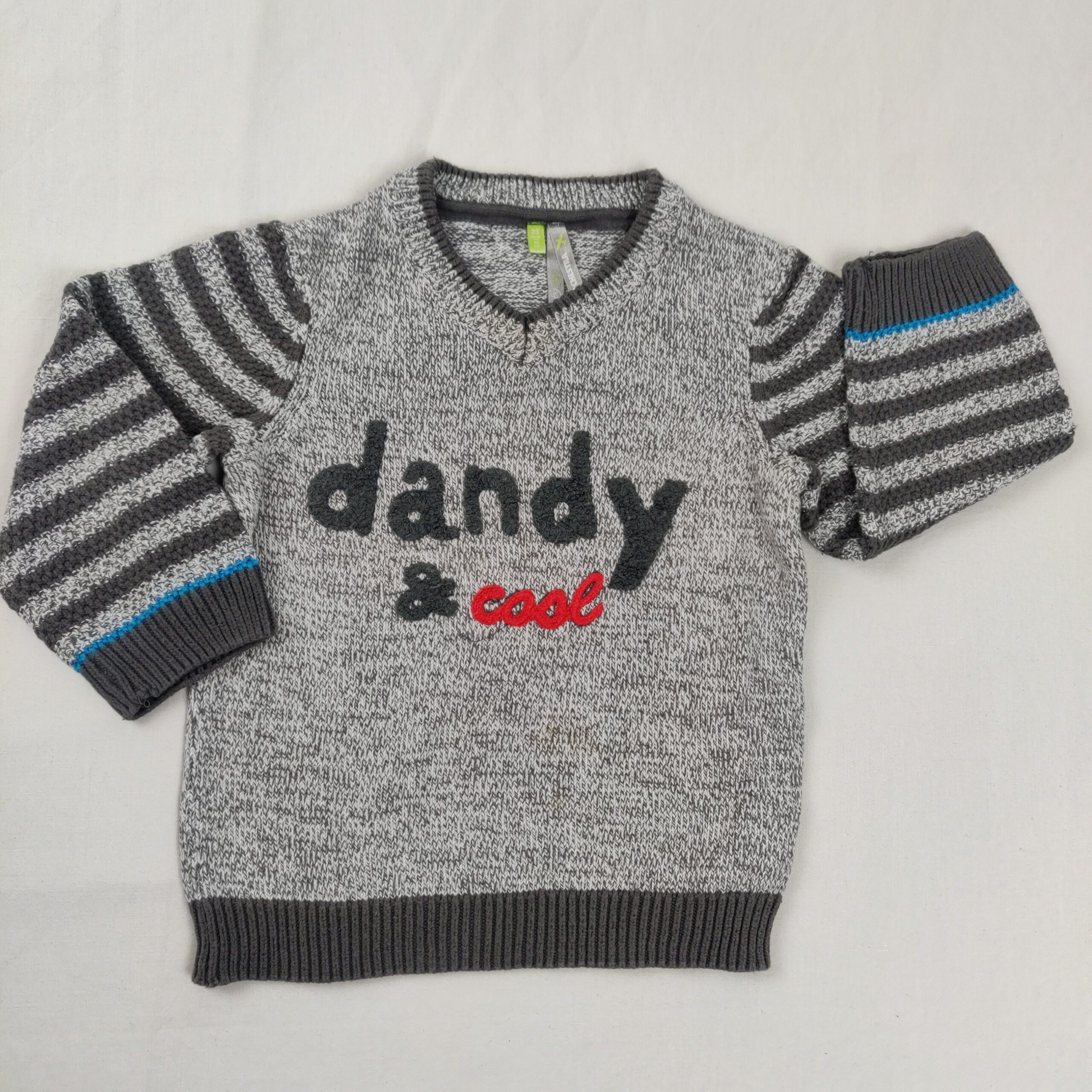 Autres commentaires : Pull gris clair brodé dandy & cool, manches rayées gris foncé, liseré bleu à l’extrémité des manches