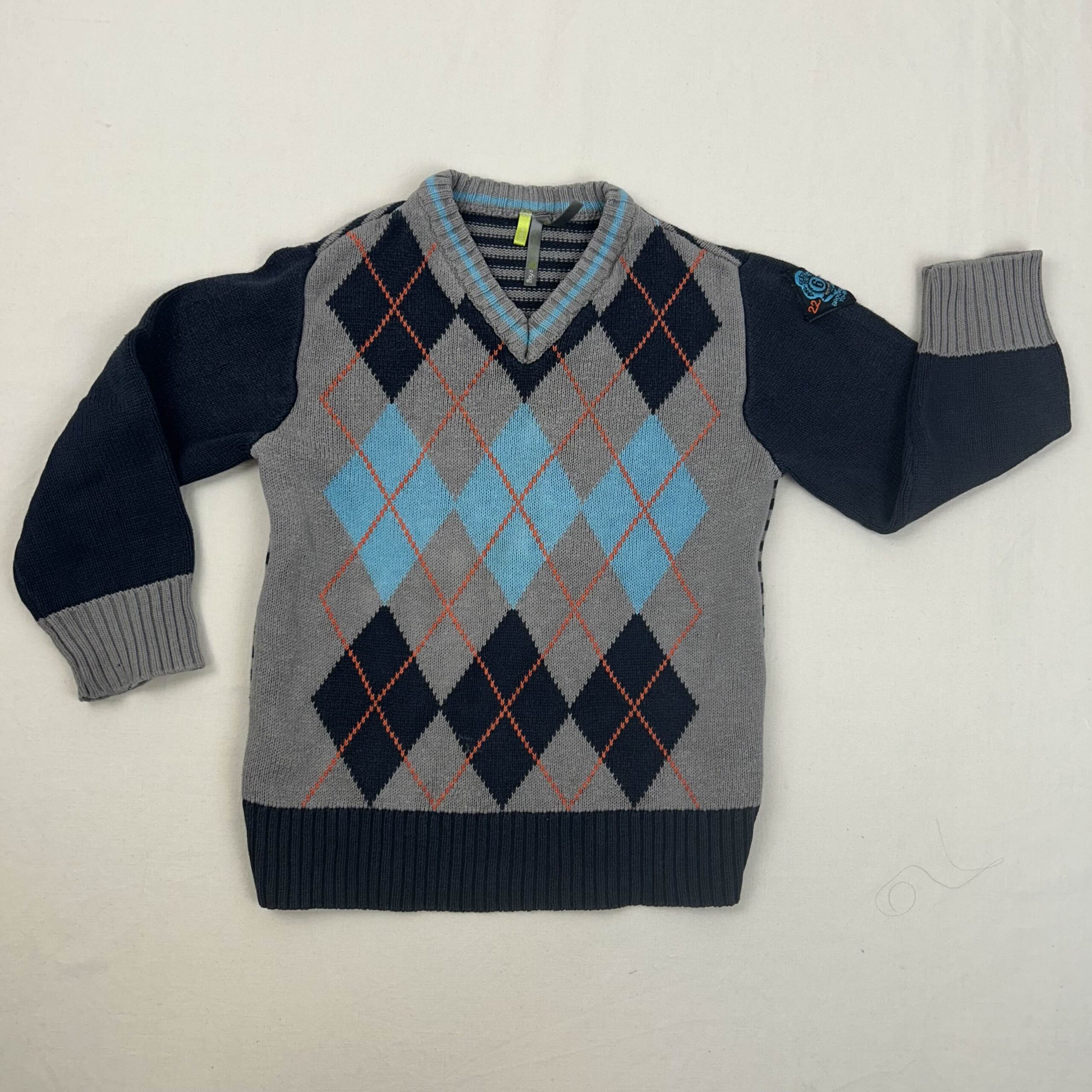 Autres commentaires : Pull gris col V manches longues, motif losanges bleu clair et bleu marine à l’avant et à rayures bleu marine dans le dos avec manches bleu marine, coton 90% et laine 10%.