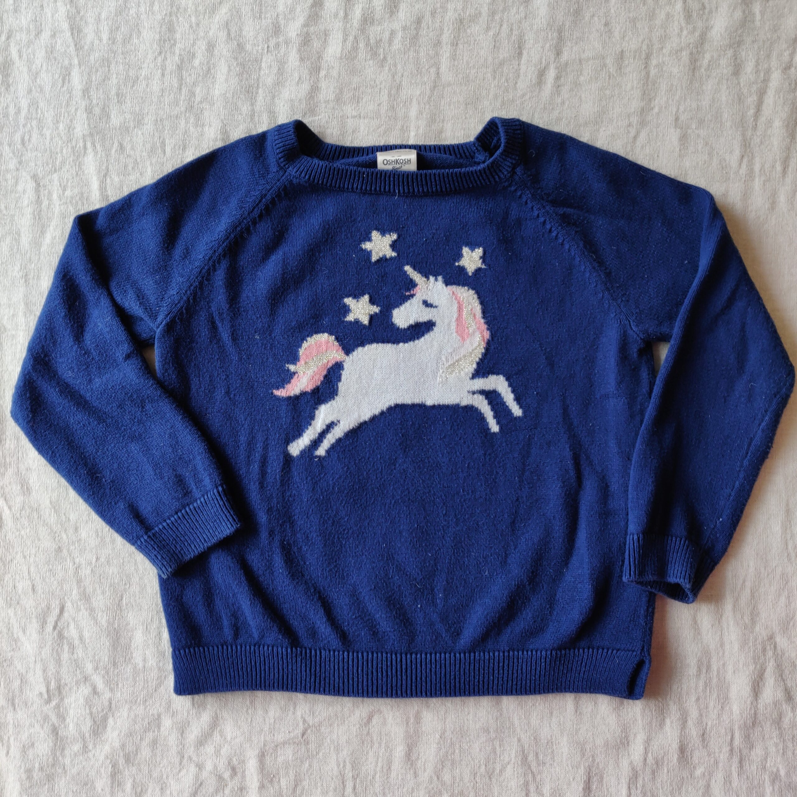 Autres commentaires : Pull bleu marine en coton, motif licorne blanche et rose, et 3 étoiles dorées