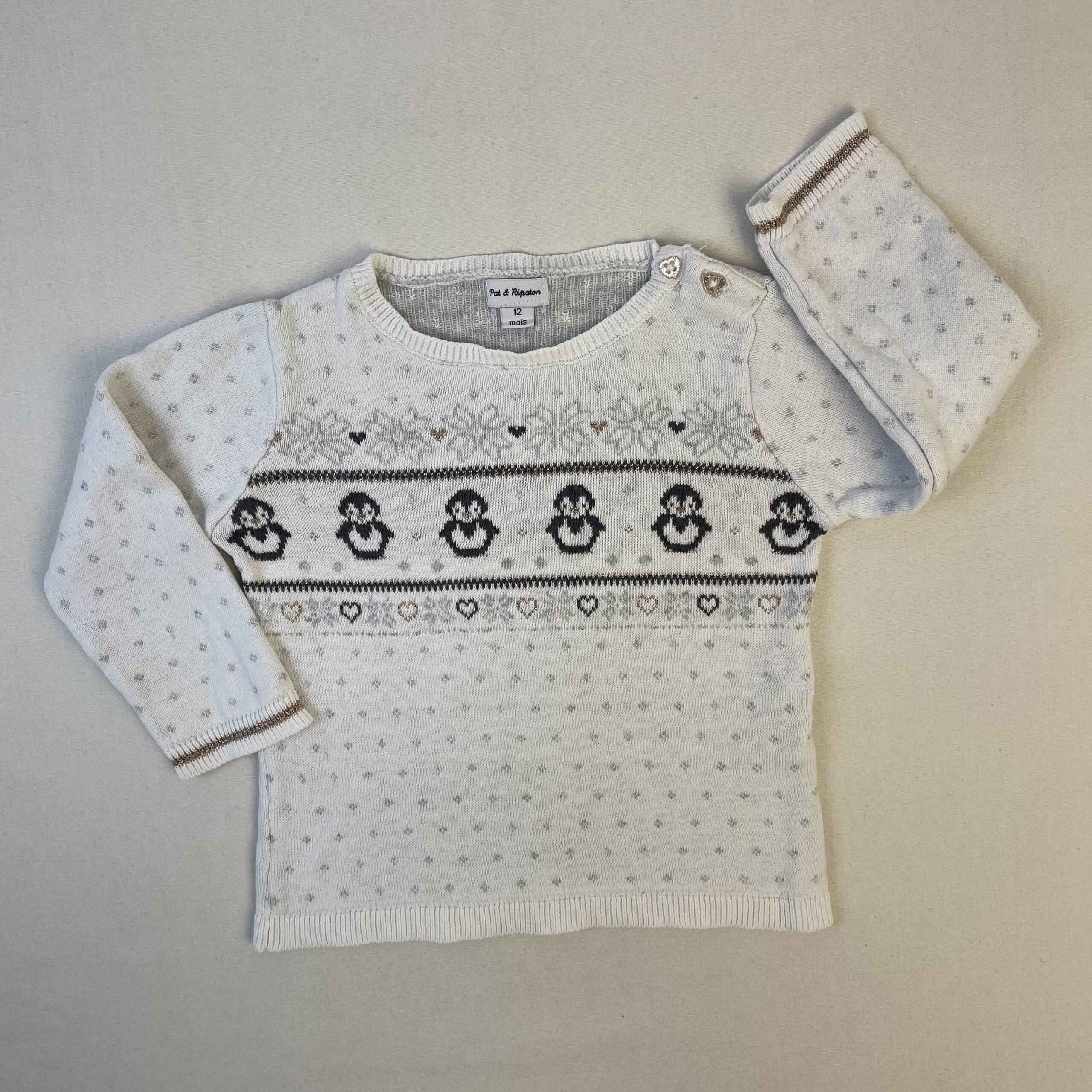 - Pull gris clair avec des motifs de pingouin, de flocon et des cœur en fil doré. Avec une ouverture boutonnée sur l’épaule gauche. Dorures aux poignets.