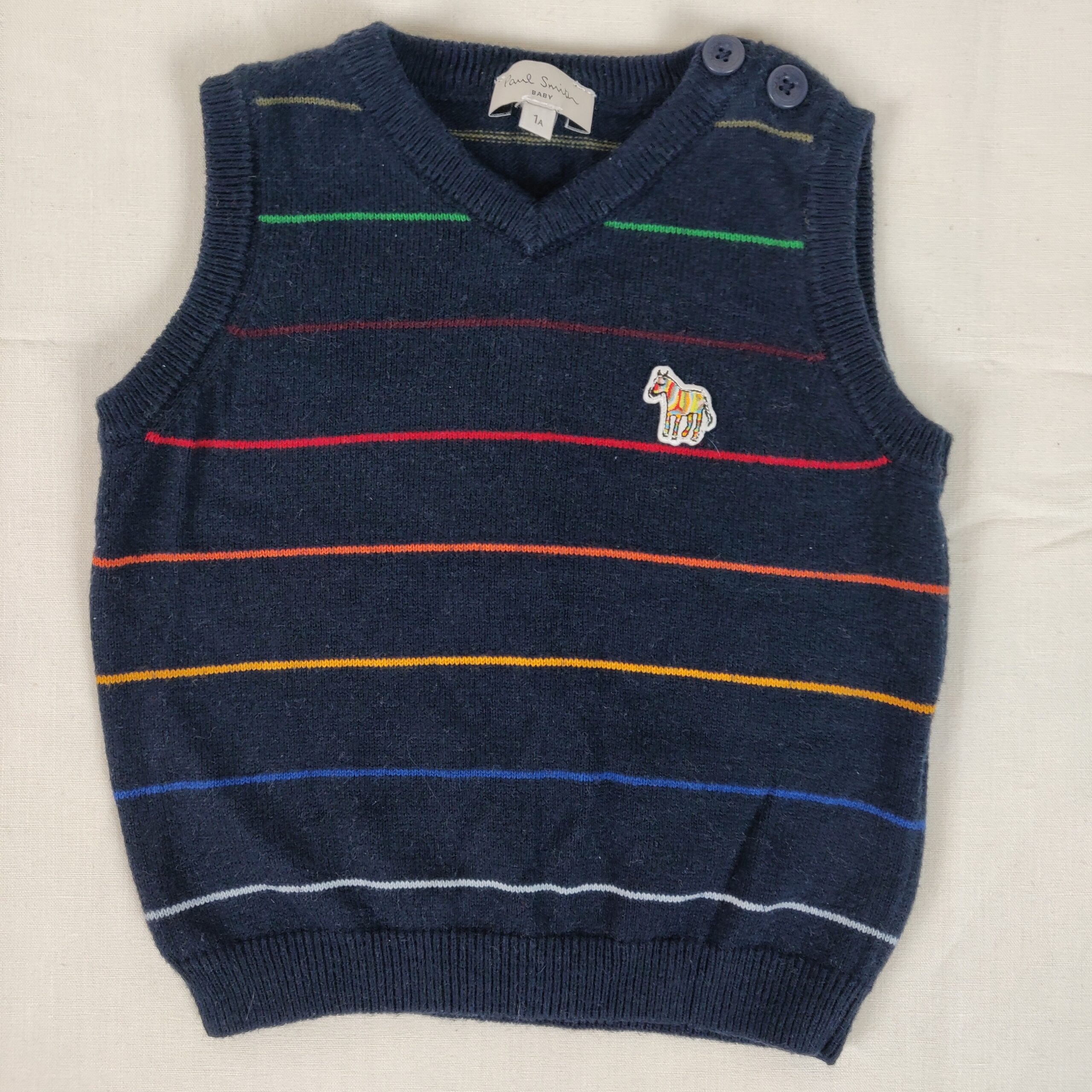 Autres commentaires : Pull sans manches, bleu marine à petites rayures multicolores, cheval multicolore en écusson au coeur. Fermeture par deux boutons à l’épaule gauche.
