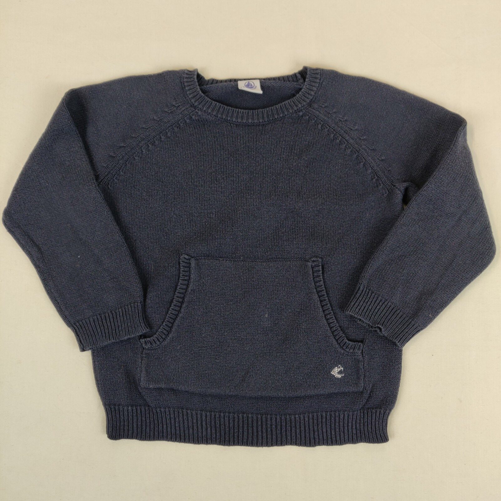Autres commentaires : Pull bleu foncé avec poche en bas du pull et contient 70% de coton et 30% de laine et des petits défaut