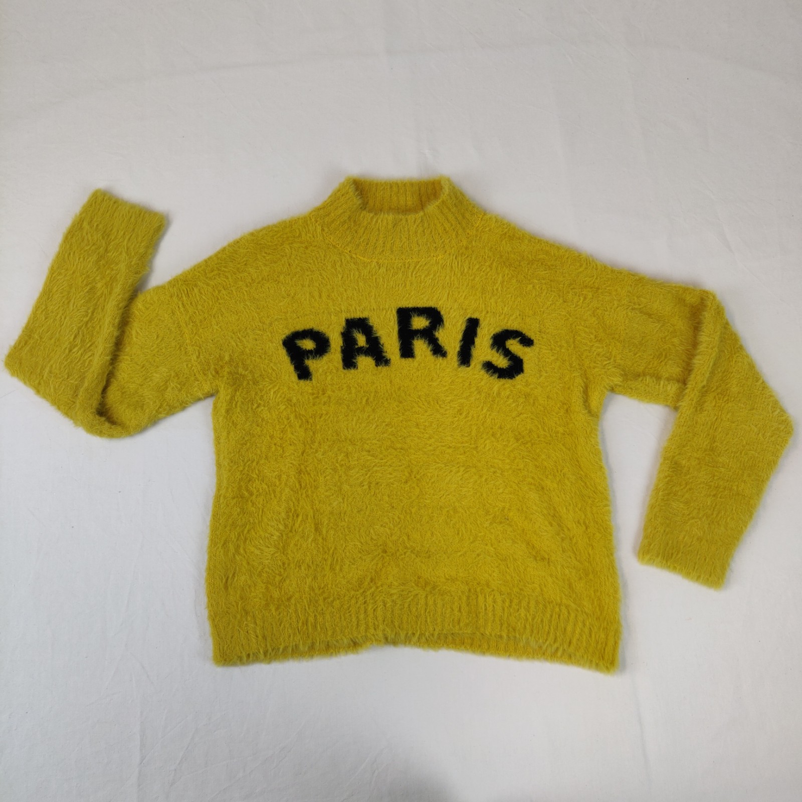 Autres commentaires : Pull jaune nylon à col chéminé 66% nylon et 34 % acrylic avec une illustration d’ecriture « Paris ».