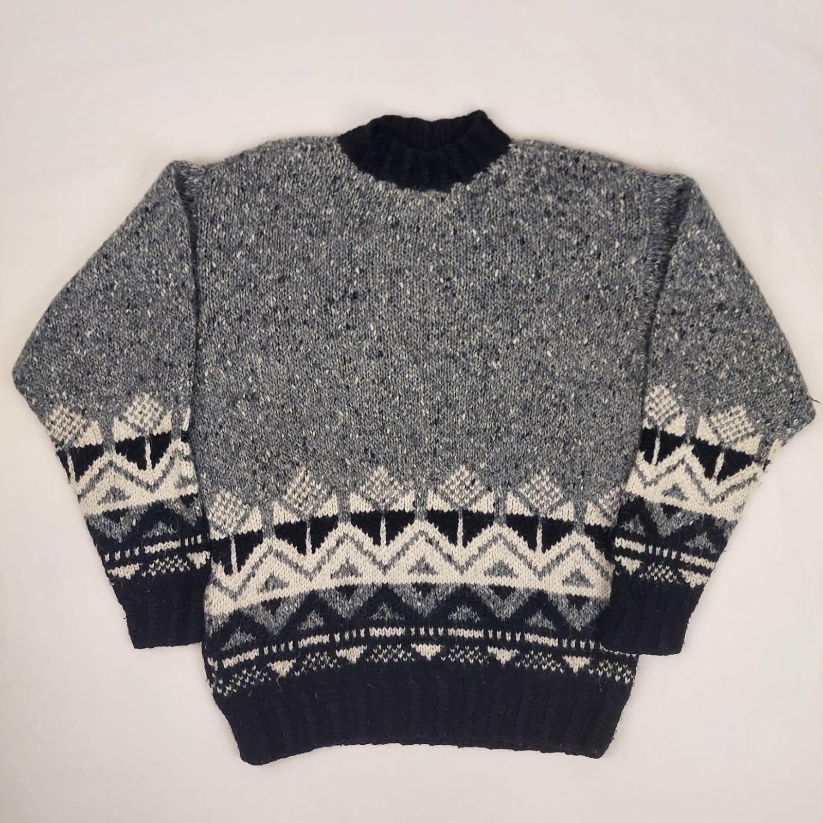 Autres commentaires : Pull oversiwe fait main, très bien tricoté. Col cheminée noir, manches et bas jacquard gris, noir et blanc. Chaud pour l’hiver