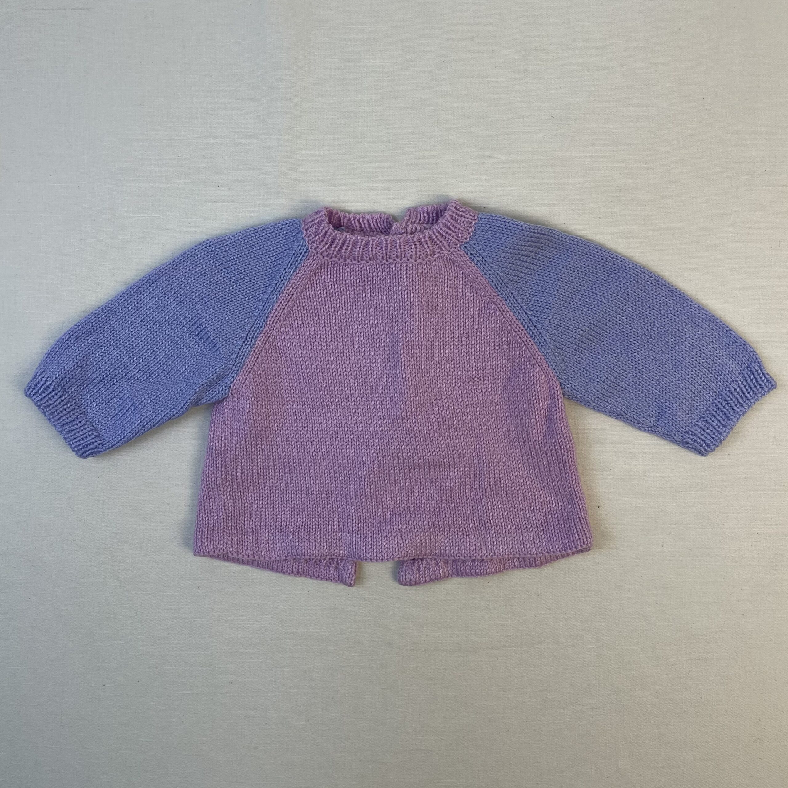 - Pull brassière tricoté, rose mauve et manches en bleu lavande, fermeture complète au dos par boutons pression. Taille estimée 1 à 3M