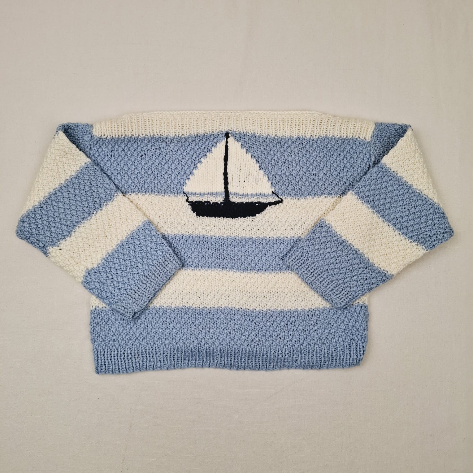 Autres commentaires : Pull marin bleu clair et écru fait main, avec motif bateau et col bateau.