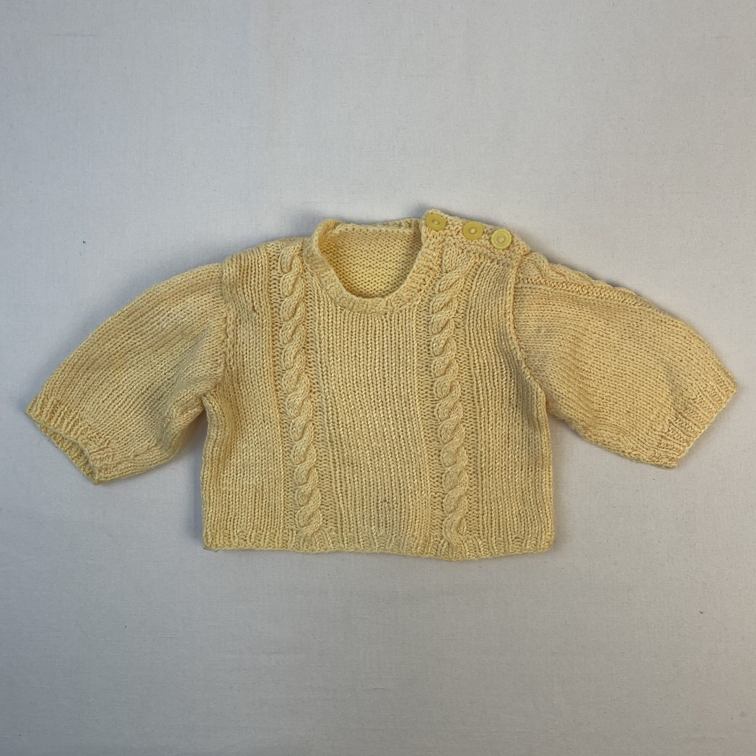 - Pull jaune en tricot, torsadé, fermeture à l’épaule gauche par boutons classiques. Taille estimée 3M.