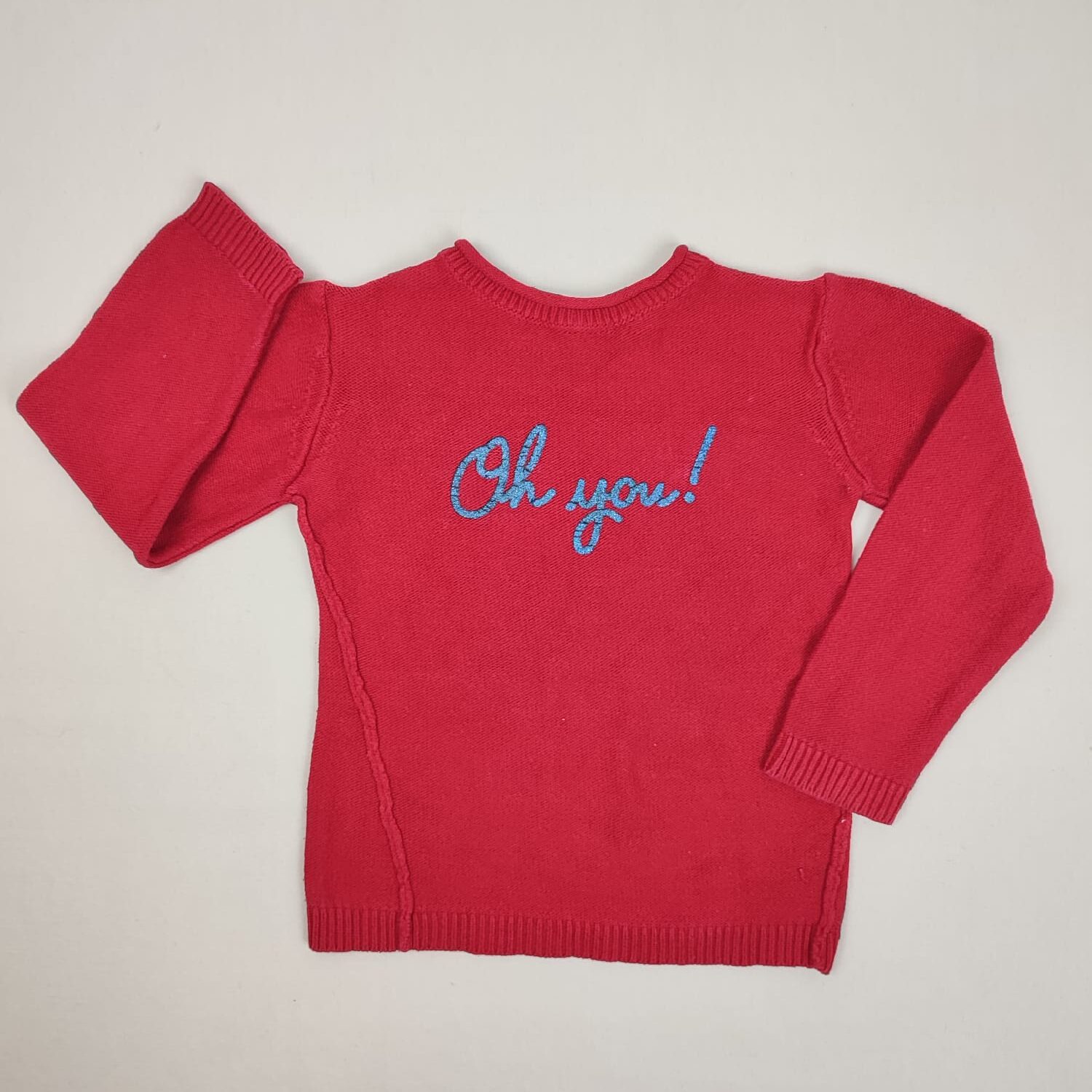 Autres commentaires : Pull en maille rouge, col rond, inscription « Oh you! » en bleu scintillant, coutures latérales apparentes.