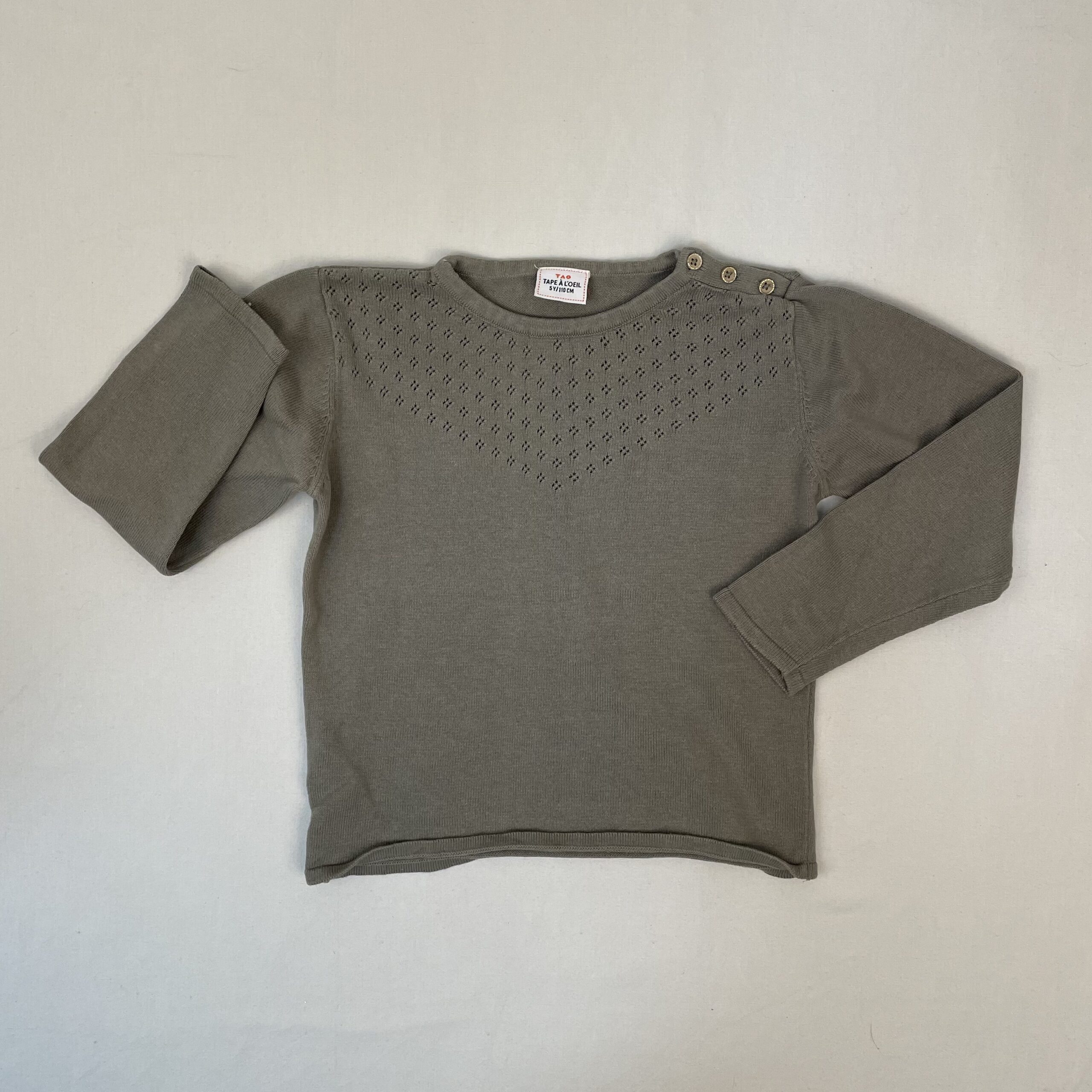 - Pull kaki, col rond, fermeture par boutons classiques sur le épaule gauche, décoration broderie devant.