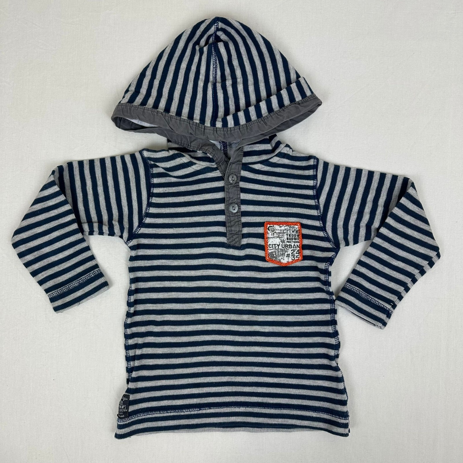 Autres commentaires : 15% viscose. Pull gris avec capuches; rayures bleu foncé et une fermeture par 2 boutons.