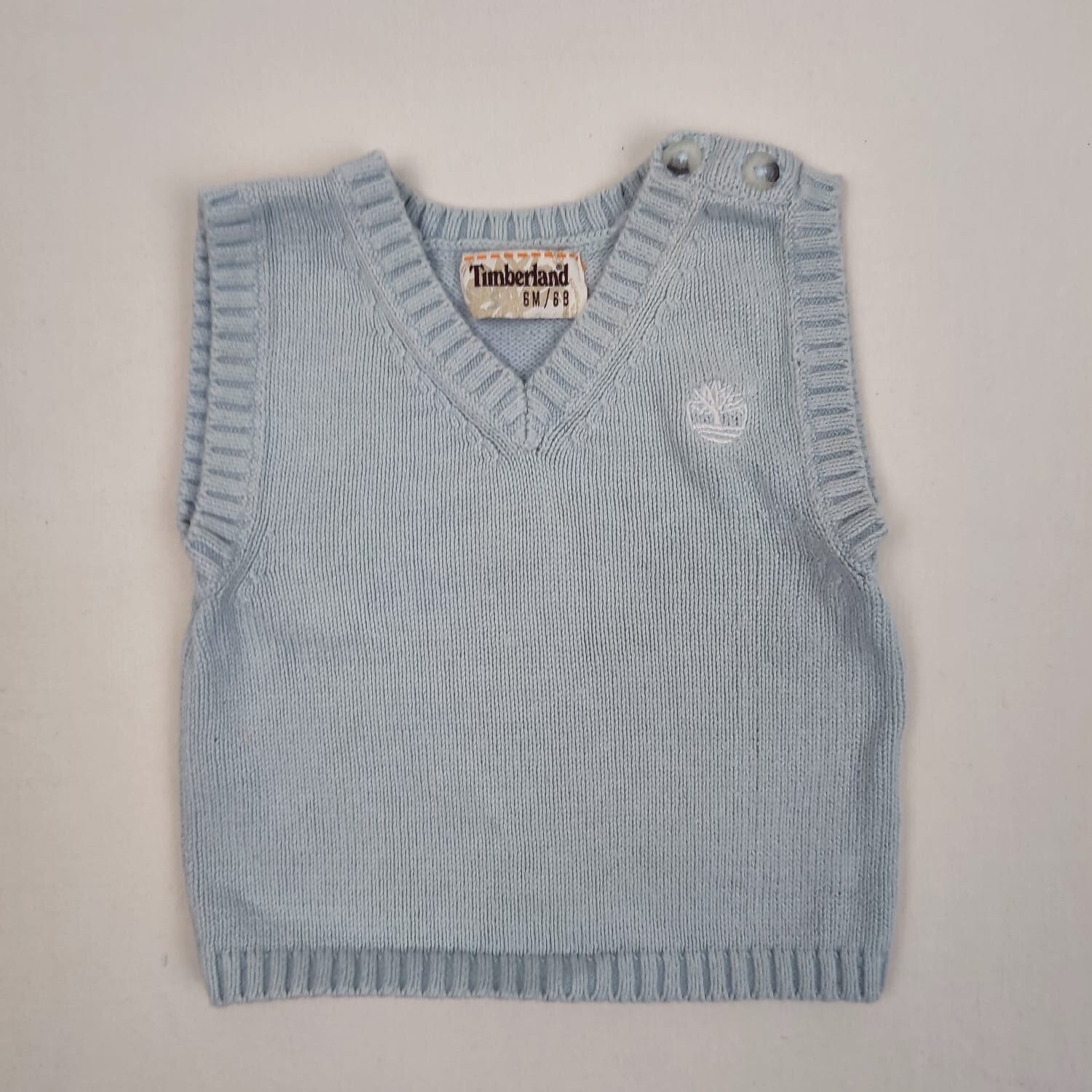 Autres commentaires : Pull fin en maille bleu très pâle sans manches, col V, motif logo en blanc sur la poitrine, fermeture par petits boutons sur l’épaule gauche.