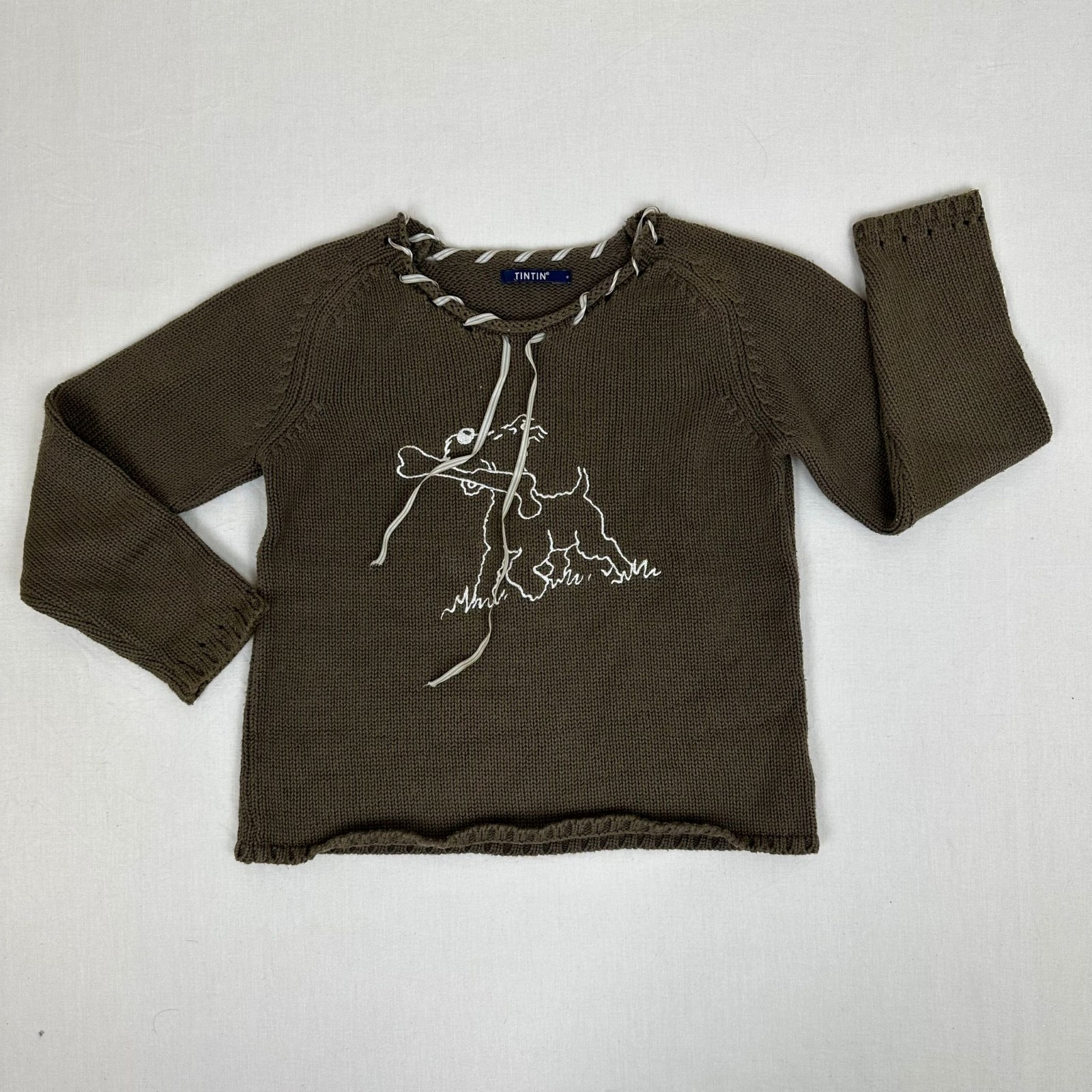 Autres commentaires : 50% acrylique. Pull marron en maille col rond avec motif chien.