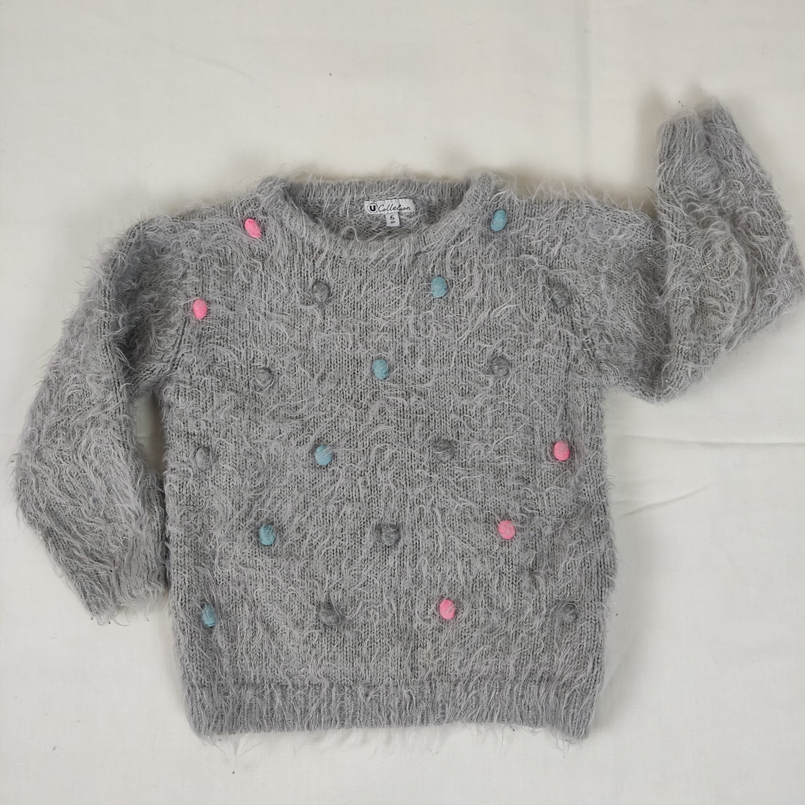 Autres commentaires : 1 pull gris avec confettis en relief bleus roses et gris – col rond