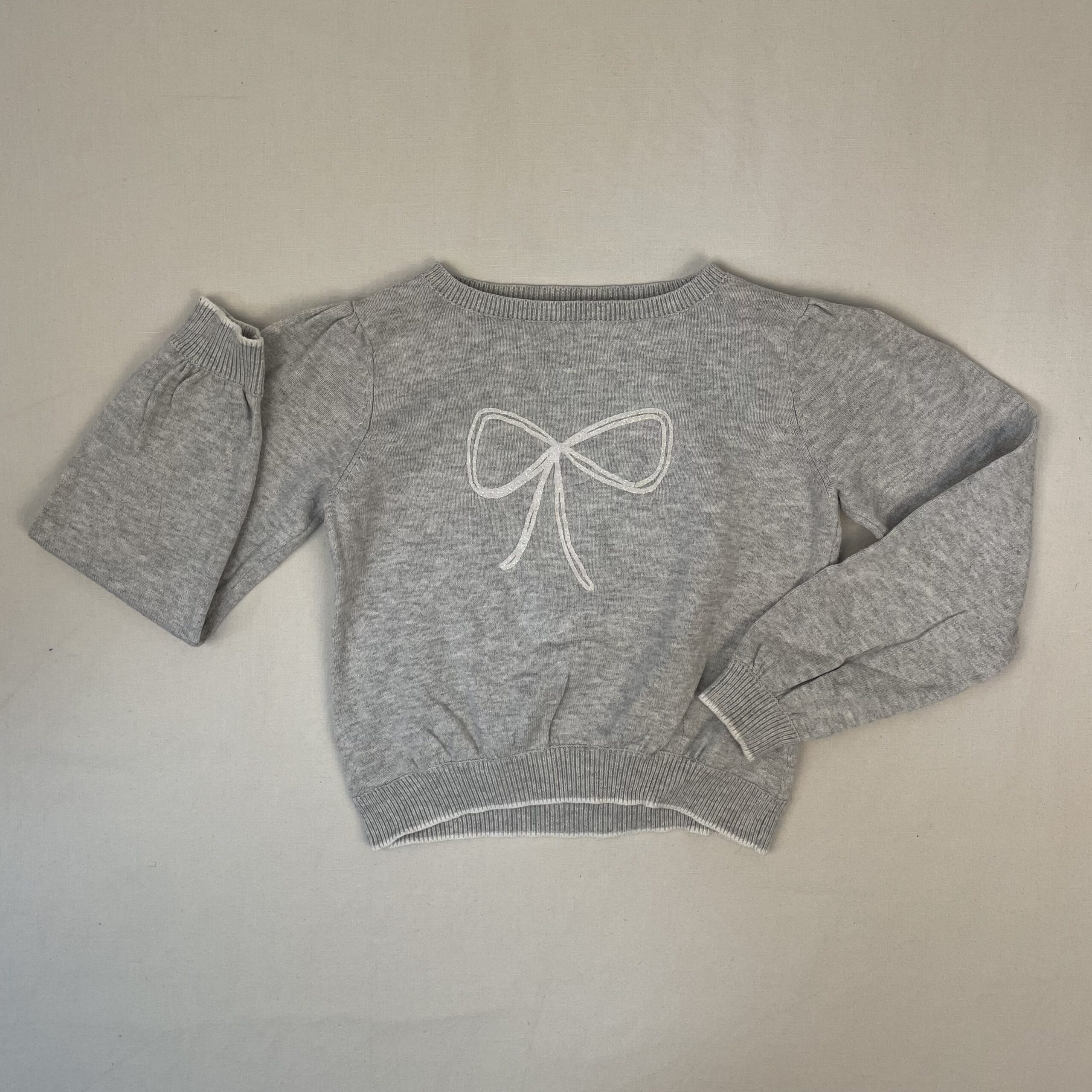 - Pull e jersey, col rond, bas et poignets élastiques, motif arc devant, petite tache sur la manche.