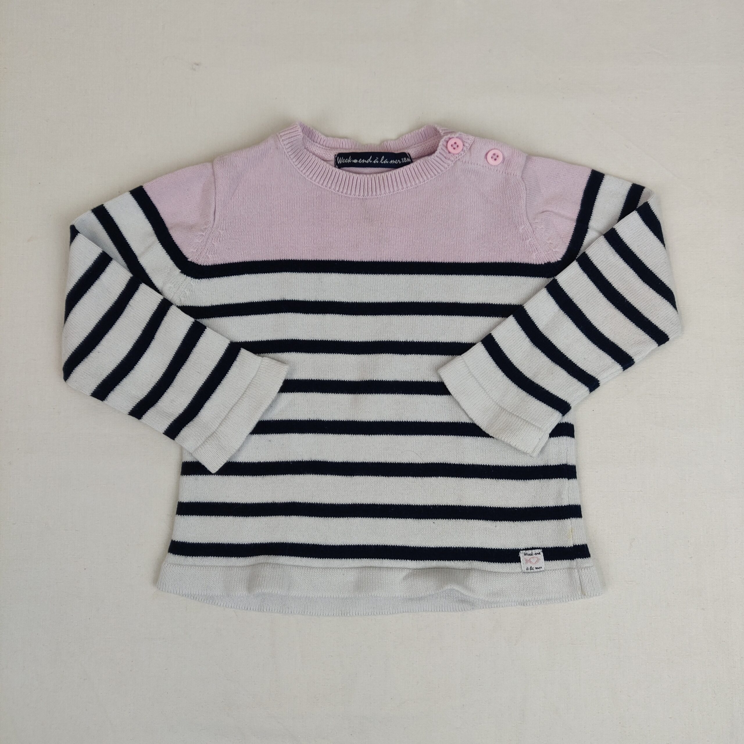 Autres commentaires : pull marinière multiclore avec des rayures horizontales bleu et blanches . 2 petites boutons à l’épaule gauche.