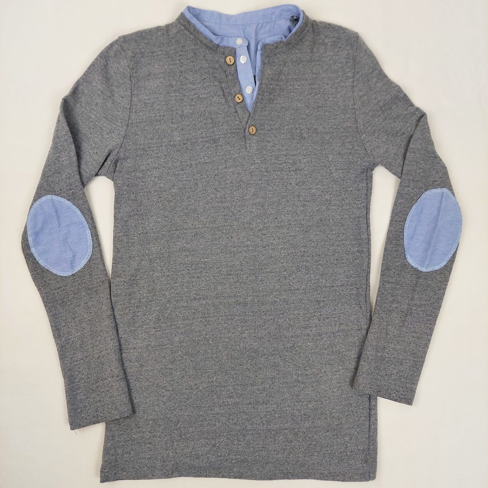 Autres commentaires : Pull long gris double col, un boutoné et un col officié en chemise, patch de textile che mise sur les coudes