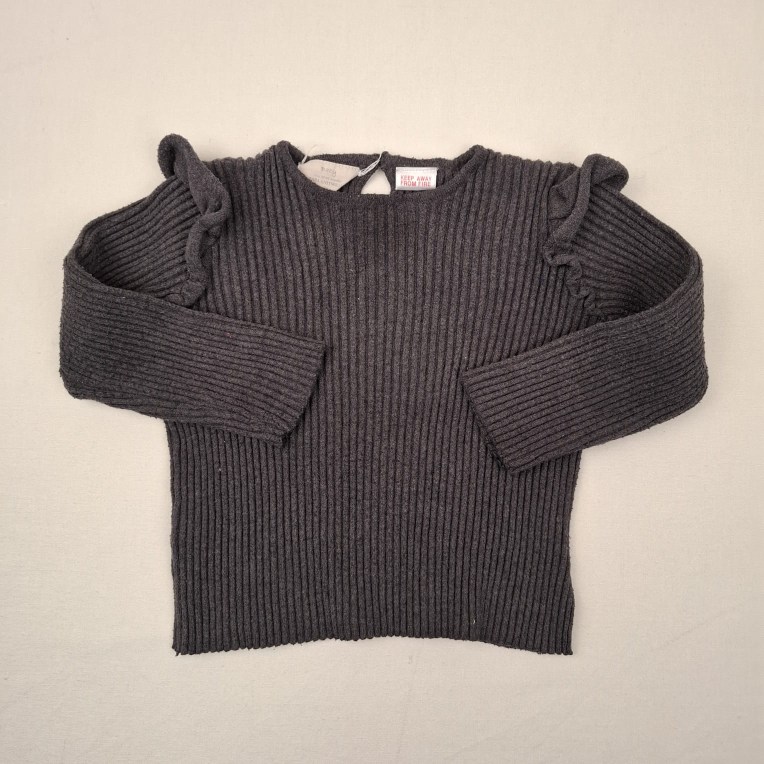 Autres commentaires : Pull en maille côtelé gris foncé à manches longues, volant à l’emmanchure, col rond, fermeture par bouton au dos, effet usé.
