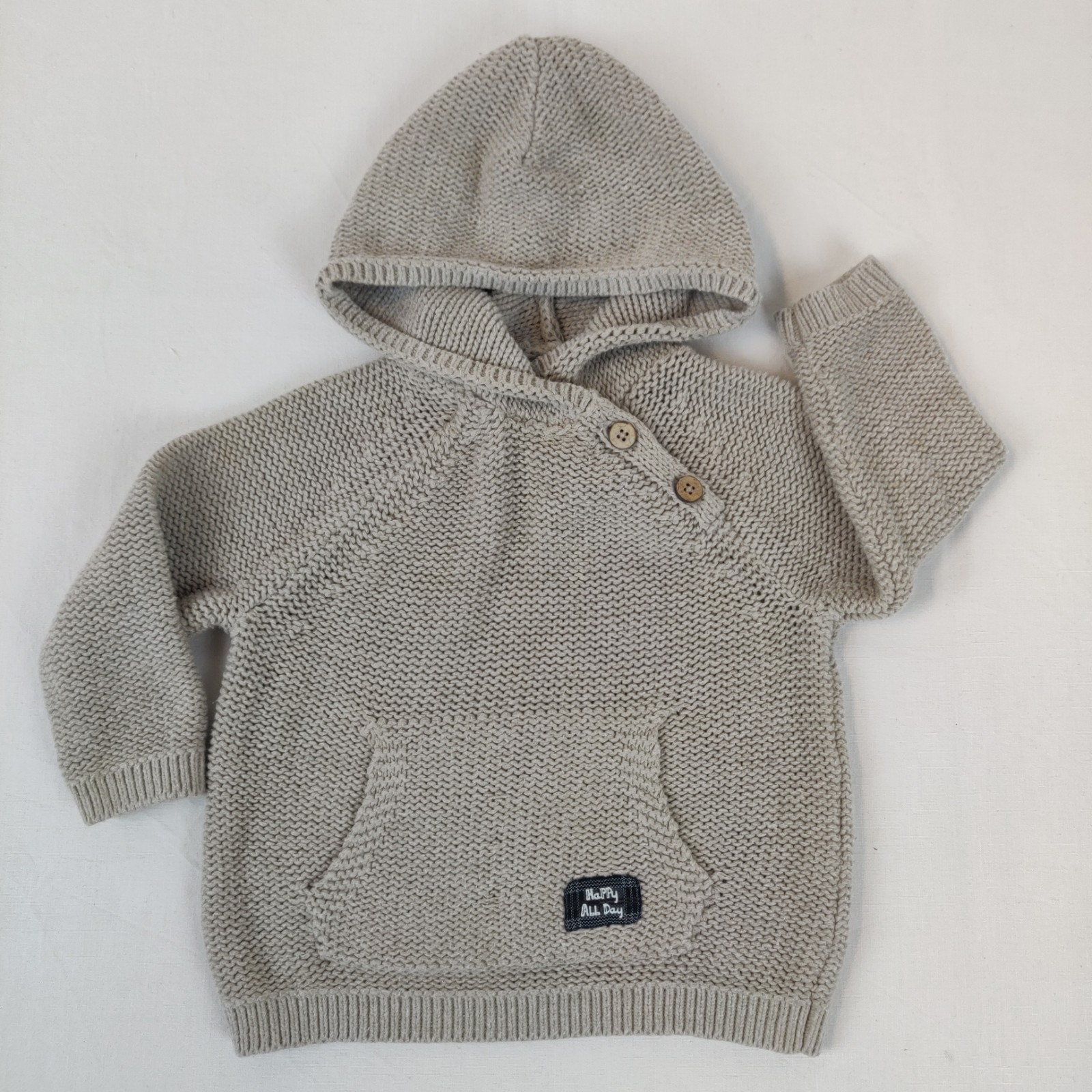 Autres commentaires : 40% acrylique. Pull à capuche en mailles marron clair. Ouverture latérale à 2 boutons. Une double poche centrale décorée d’un écusson avec l’inscription « Happy all day ». Usure normale.