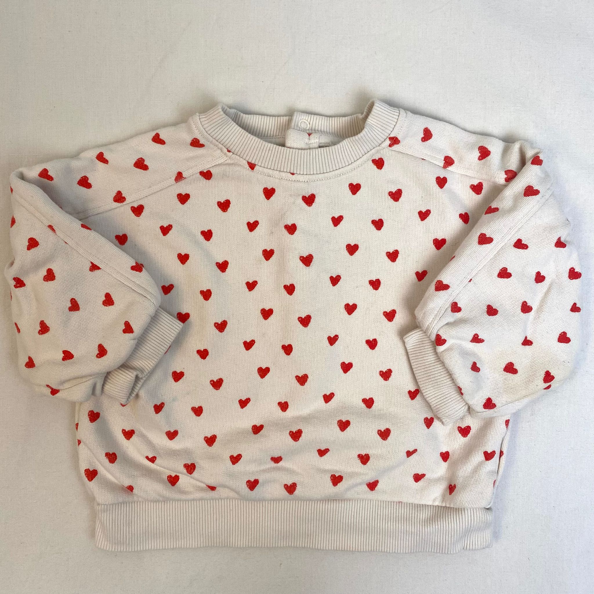 Sweat en molleton blanc crème, motifs coeurs rouges, fermeture par boutons pression au dos, finition bord-côte au col, poignets et à la base, petite tache sur la manche gauche.