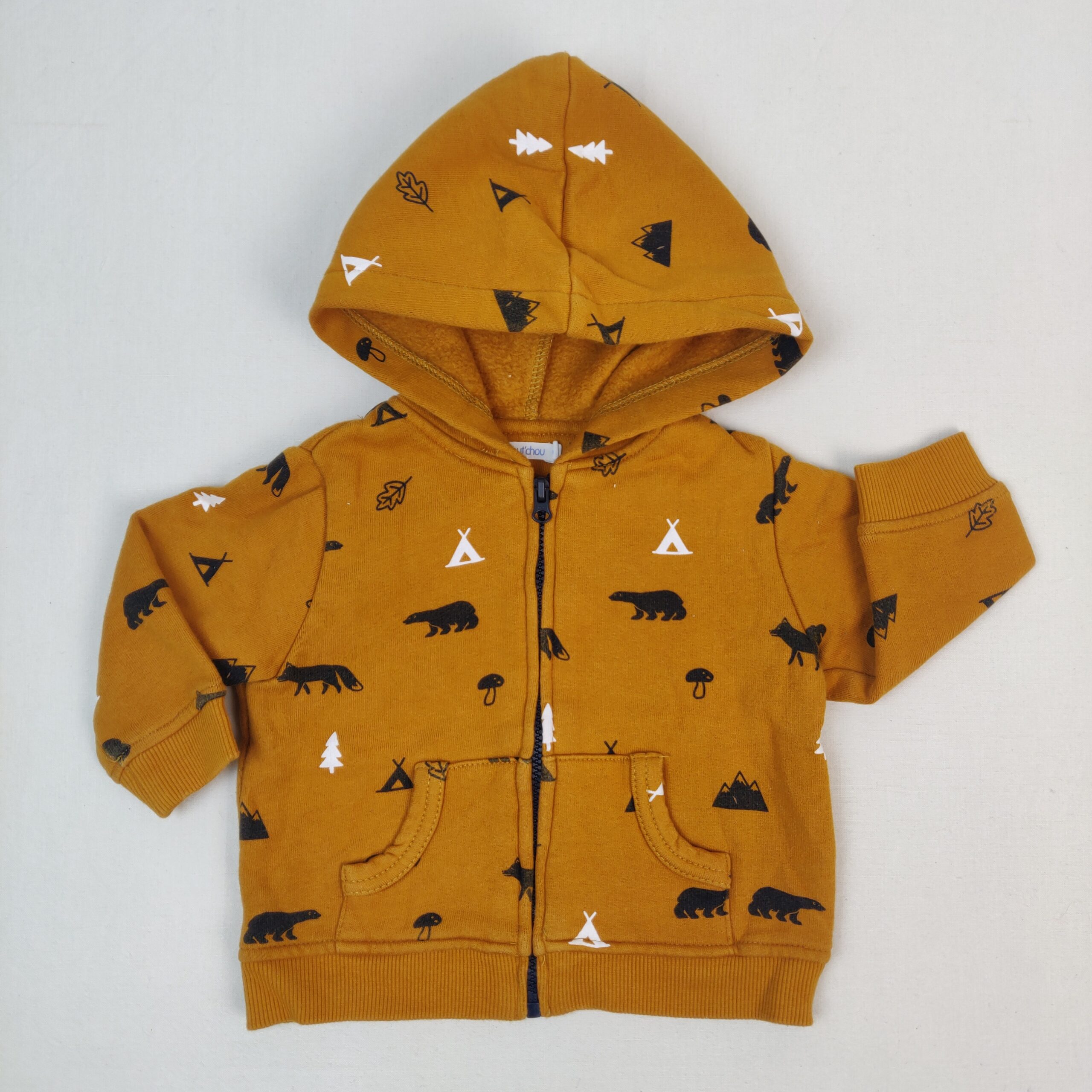 Autres commentaires : 22% Polyester, 2% élasthanne, Sweat- gilet ocre à capuche, motifs ours, renards, samins champignons, montagnes, tipis en noir et blanc, fermeture par zip.