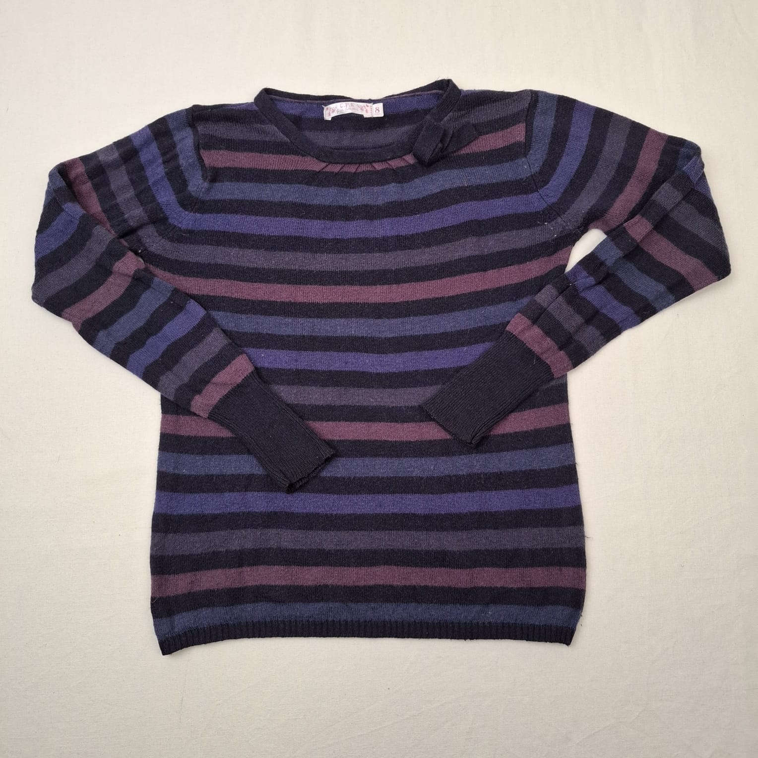 Autres commentaires : 30% polyamide, 15% angora. Pull léger bleu marine à rayures violettes et bordeaus, col rond, noeud assorti.