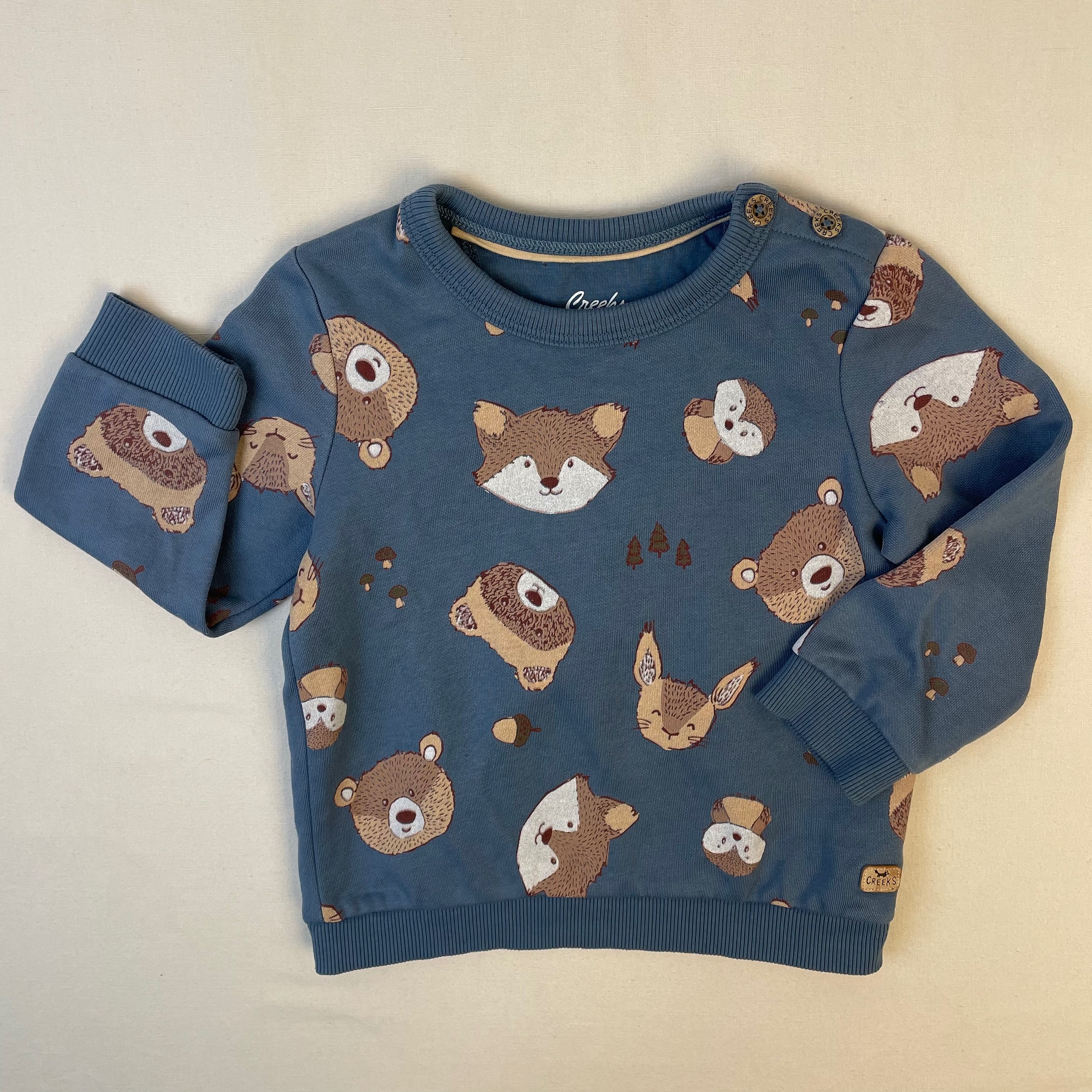- Sweat bleu avec des motifs d’ours, d’oiseau, de renard et de lapin de couleur marron avec des éléments de la forêt.