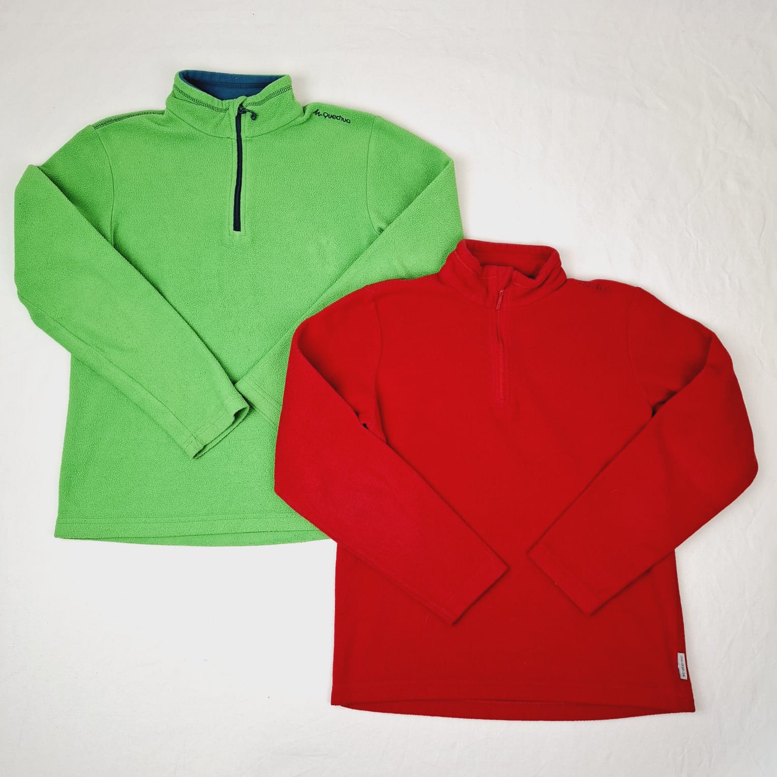 Autres commentaires : Lot de 2 sweats en polaire, col cheminée zippé au niveau de l’encolure : – un rouge gamme Quechua en polyester recyclé – un vert pomme avec intérieur et zip bleu roi, gamme Stratermic. Petit défaut : tache sur la manche. Niveau réduit du lot de Kiwi à Fraise.