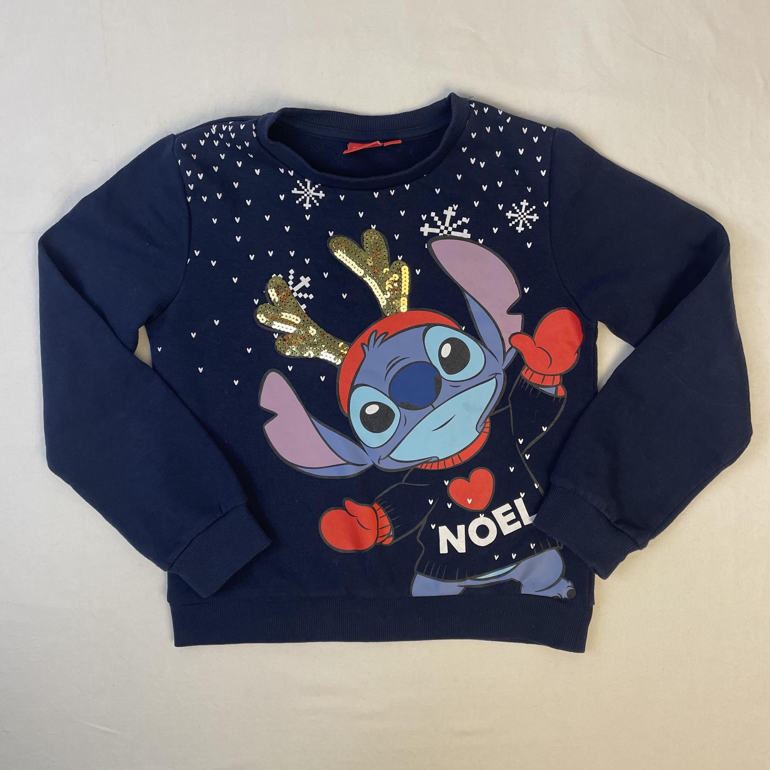 - Sweat bleu marine, idéal pour Noël, devant personnage Stitch avec un bonnet de rennes avec les bois en sequins dorés et inscription « Noël ».